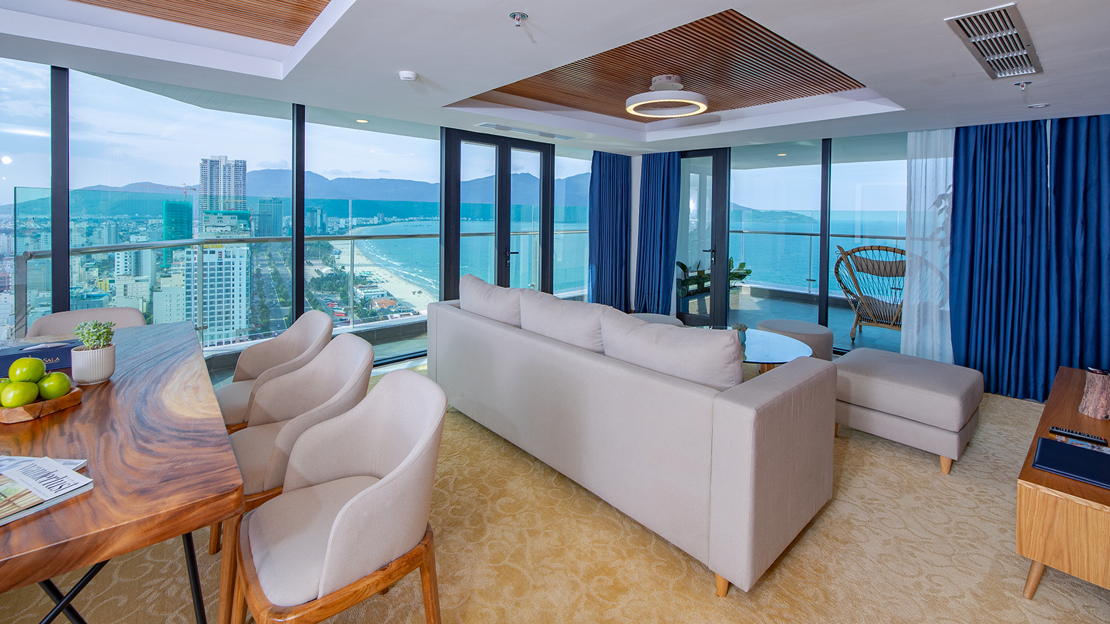 Phòng lớn nhất và sang trọng nhất tại Sala Đà Nẵng Beach là Phòng Tổng thống. Phòng cung cấp cho bạn và người thân những tiện nghi hiện đại và phong cách nhất tại khu vực gần trung tâm Đà Nẵng. Phòng tổng thống được trang bị ghế sofa sang trọng và thoải mái cạnh ban công. Ngả lưng trên ghế sofa, nhâm nhi thức uống yêu thích và hòa mình vào khung cảnh biển nên thơ, lãng mạn.