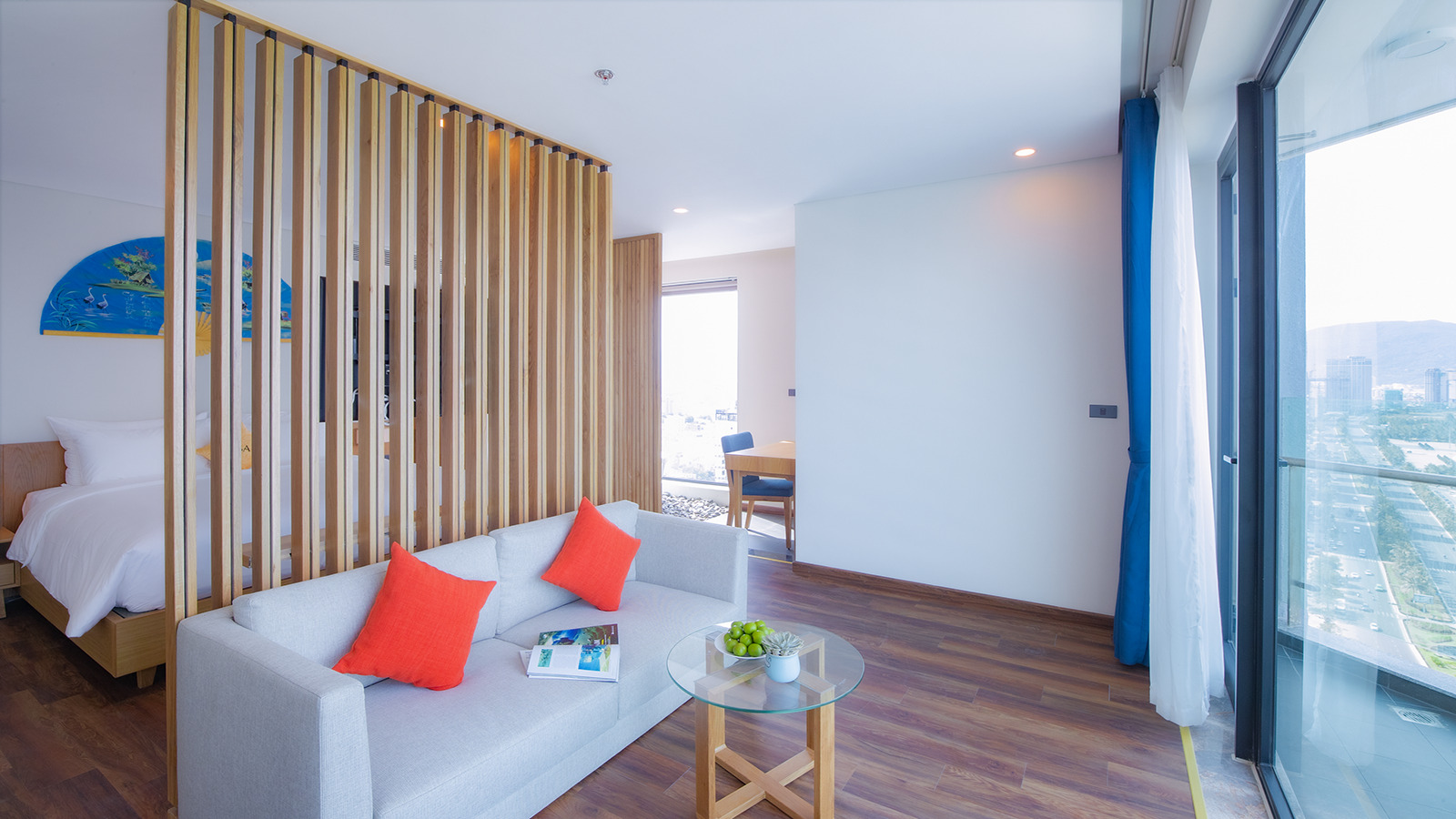Diện tích của căn phòng này là 45m2, có 1 giường đôi. Phòng được sơn một màu trắng sang trọng cùng màu xanh của rèm cửa, sofa tạo nên sự hài hòa pha trộn tuyệt đẹp cho không gian nghỉ nơi của du khách. Được nằm ngay bãi biển Mỹ Khê tuyệt đẹp của thành phố Đà Nẵng nên căn phòng được xây dựng với bạn công lớn tầm nhìn ngay ra bãi biển này.