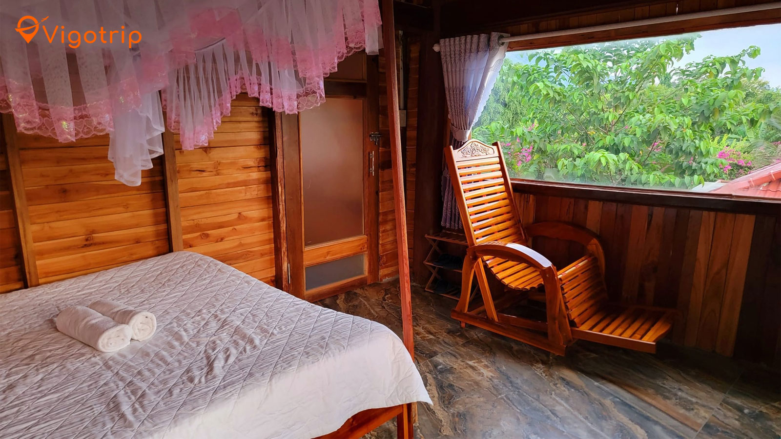 Điểm cộng của Green Bamboo Lodge là không gian ngoài trời rộng rãi, thích hợp cho các buổi tiệc nướng hay các buổi tối ngắm cảnh, trò chuyện cùng bạn bè. Nhà hàng Ca Lang trong khuôn viên resort phục vụ cả món ăn phương Tây và đặc sản địa phương. Với mức giá phòng khoảng 150.000 VNĐ/người/đêm, Green Bamboo Lodge cũng cung cấp các phòng nghỉ đầy đủ tiện nghi, bao gồm tủ quần áo, phòng tắm hiện đại, vòi sen và đồ vệ sinh cá nhân miễn phí.