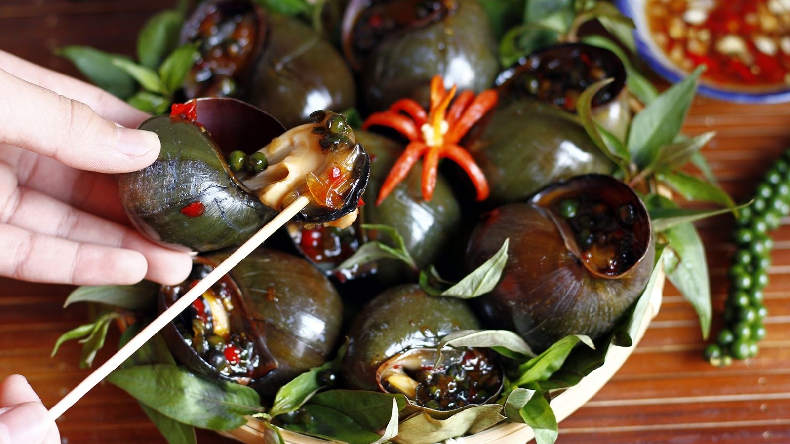 Ốc nướng tiêu, cá lóc nướng trui – món ăn dân dã, dễ tìm tại chợ đêm.