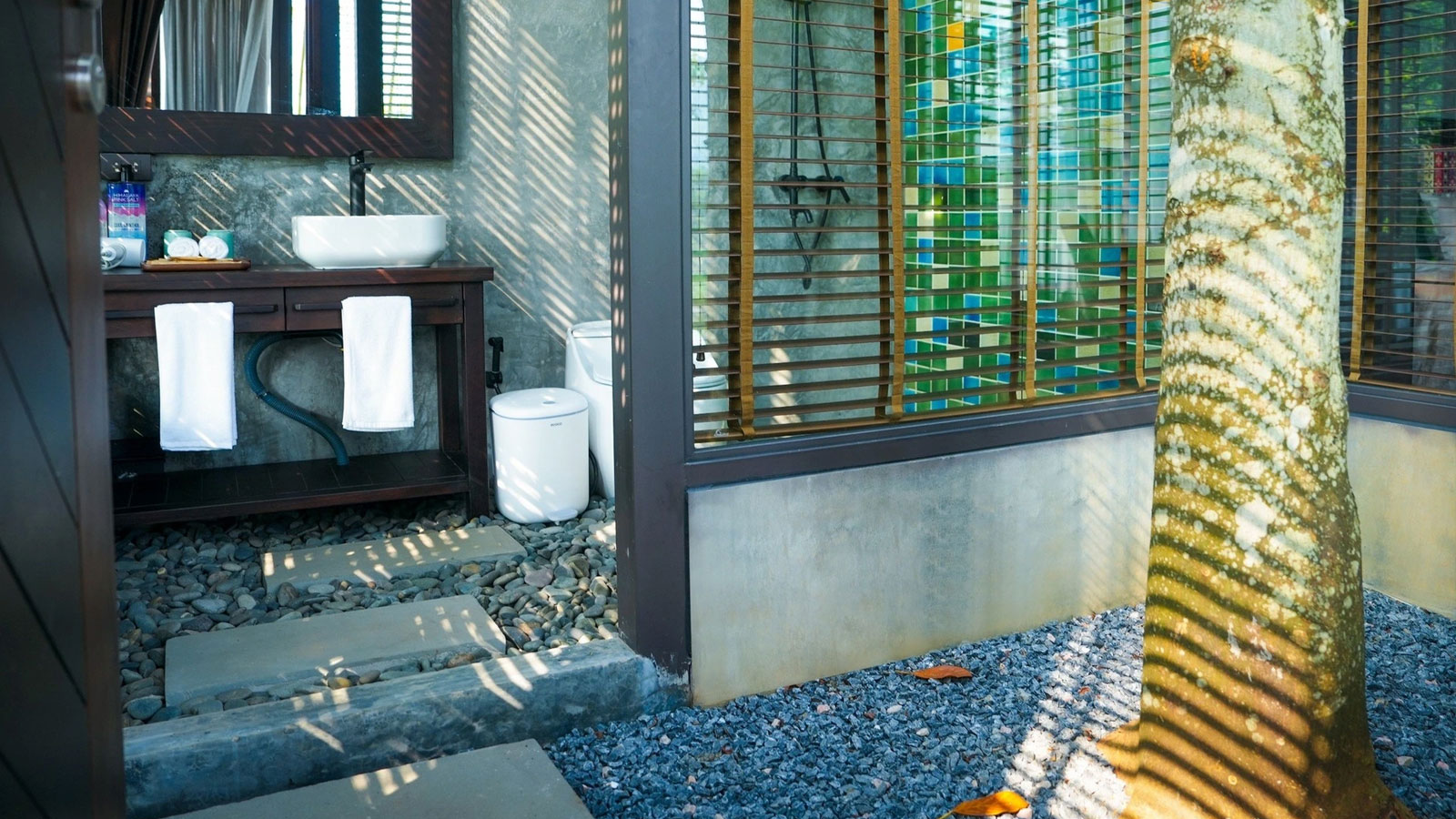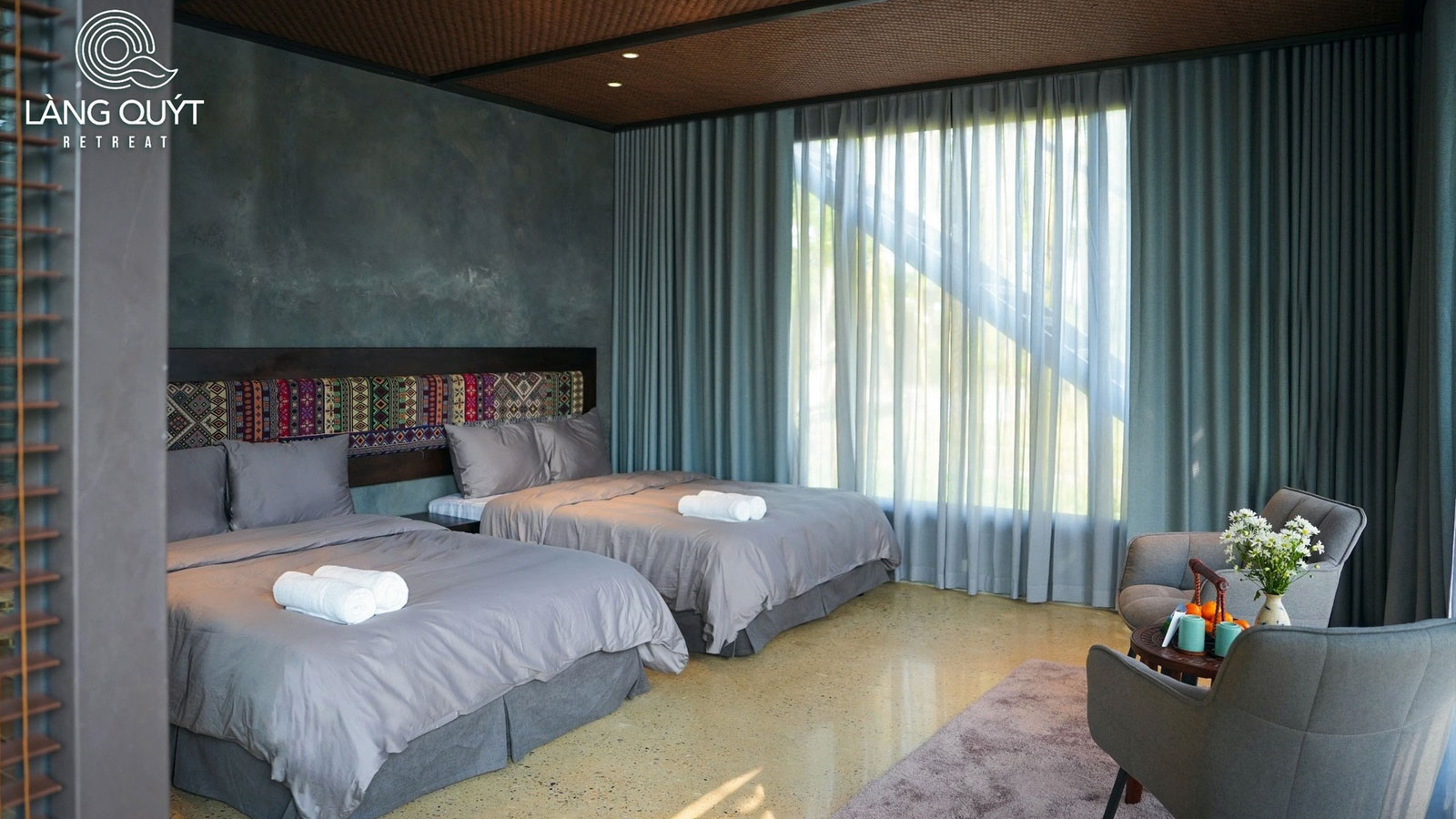 Nằm nép mình bên rặng trúc xanh rì rào, căn bungalow dành cho 4 người được hưởng trọn một không gian yên tĩnh và thư giãn nhất tại Làng Quýt Retreat. Căn bulgalow này đặc biệt được yêu thích. Bởi ngay chính lối đi vào khu vực phòng tắm là một cây mít, được các kiến trúc sư thiết kế khéo léo giữ lại. Mà không phải chặt đi, trong quá trình thi công xây dựng. Đây cũng là niềm tự hào của Làng Quýt Retreat với một thiết kế ấn tượng, giữ gìn thiên nhiên nguyên bản vốn có.