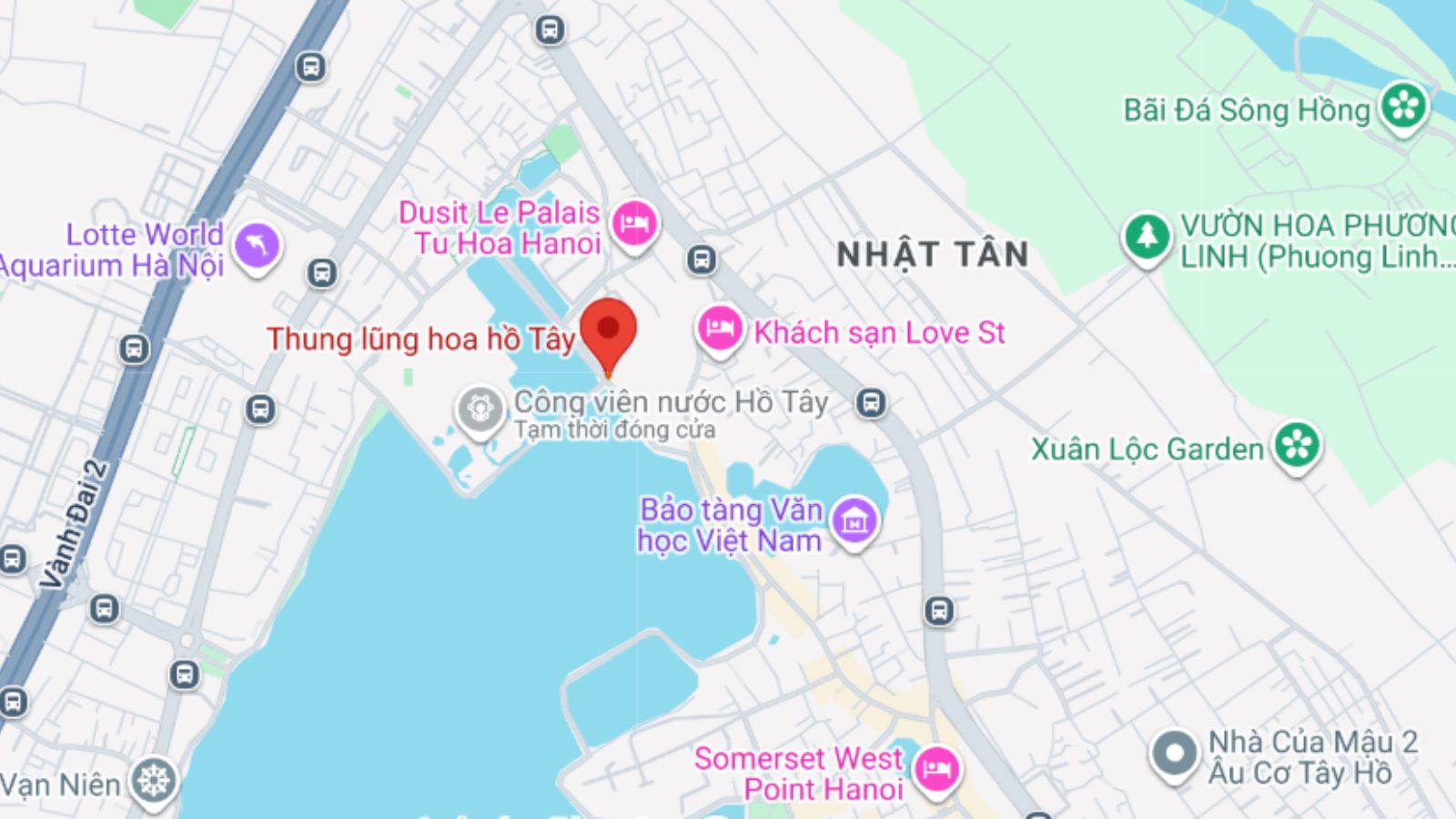 Thung lũng hoa Hồ Tây nằm trên địa bàn quận Tây Hồ, Hà Nội, gần các tuyến đường ven hồ và khu vực trung tâm thành phố. Đây là khu tham quan được quy hoạch với nhiều loại hoa trồng theo mùa, kết hợp cảnh quan mở, phù hợp cho hoạt động tham quan, chụp ảnh và nghỉ ngơi ngắn ngày.