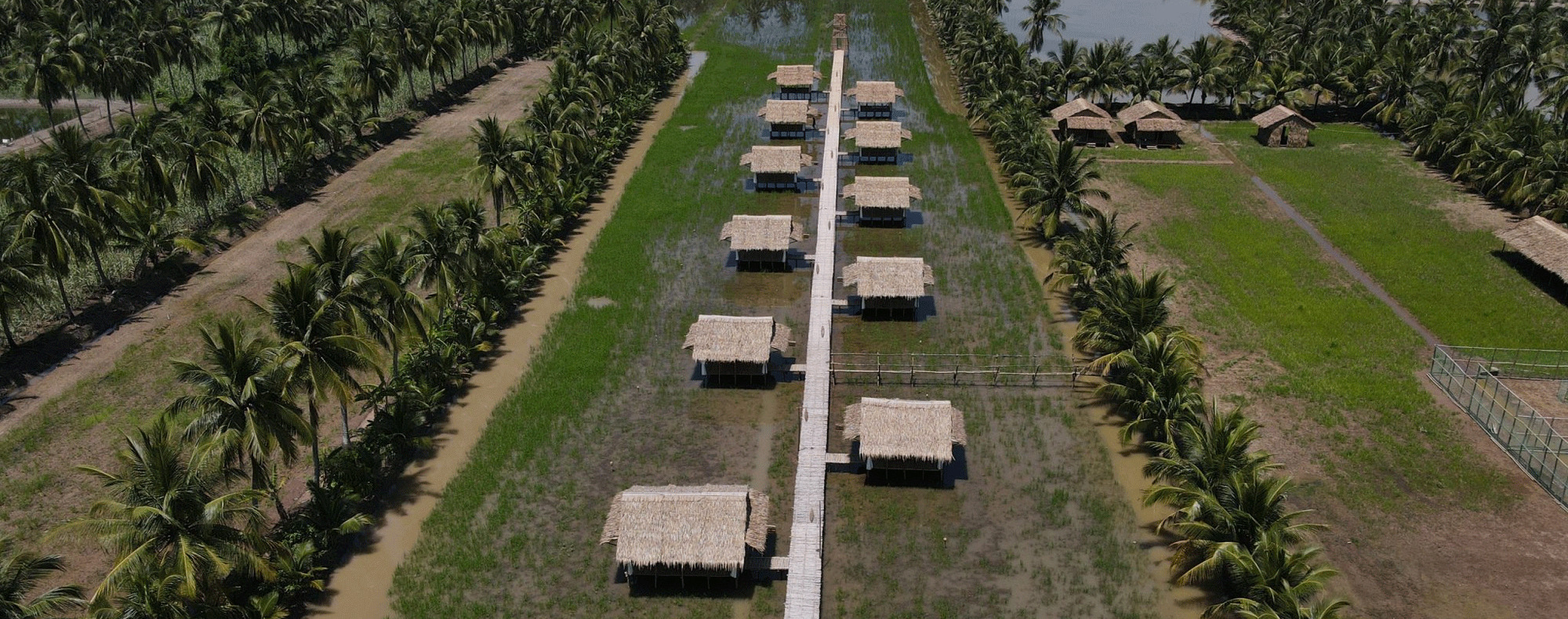 Nông trại Rithy đã thiết kế rất nhiều căn chòi nhỏ, với cách đặt tên cực sáng tạo là theo các tỉnh, thành phố quốc gia trên thế giới. Mỗi chòi rộng rãi, trang bị thêm chiếc võng tựa lưng nghỉ ngơi. Giúp du khách có những giây phút thư giãn thoải mái bên bạn bè, người thân. Tận hưởng không khí trong lành, làn gió mát rượi, hít hà hương thơm của ruộng lúa xua tan mọi áp lực căng thẳng.