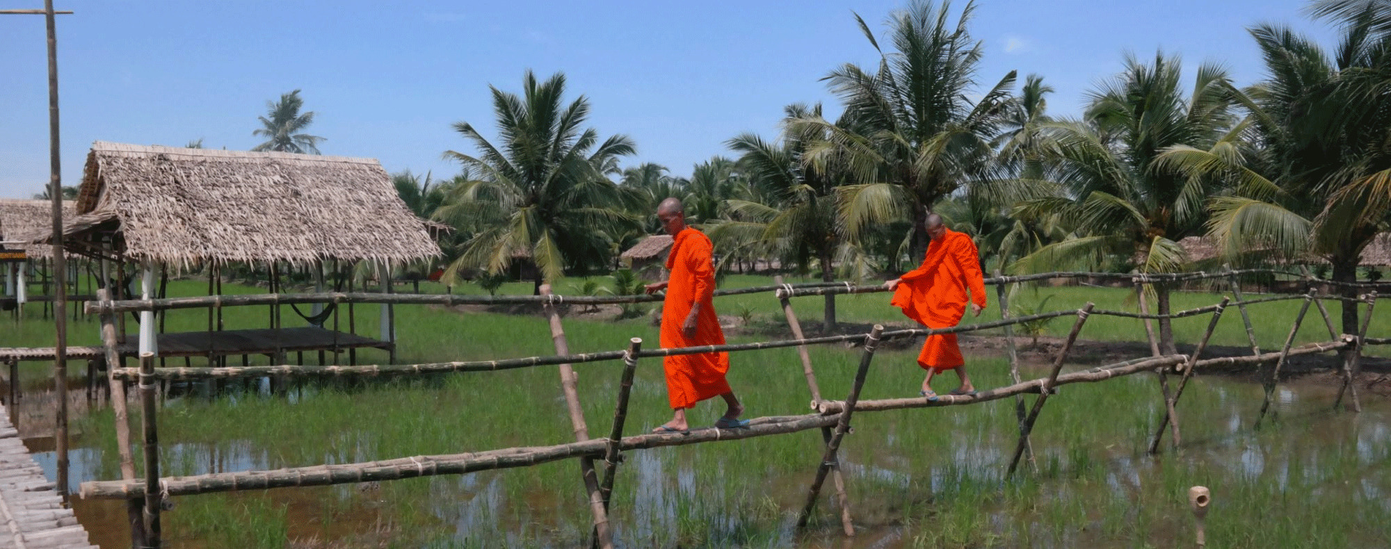 Thử thách đi trên chiếc cầu khỉ dài bắt ngang cánh đồng khiến du khách cảm thấy hồi hộp, lo sợ nhưng rất thú vị. Ngoài trải nghiệm cầu khỉ rung lắc, bạn còn được tự mình chèo thuyền lướt nhẹ trên sông nước, mò ốc, câu cá, bắt vịt, hái rau đủ loại… Đây chắc chắn sẽ là một kỉ niệm khó quên cho chuyến du lịch Miền Tây của bạn.