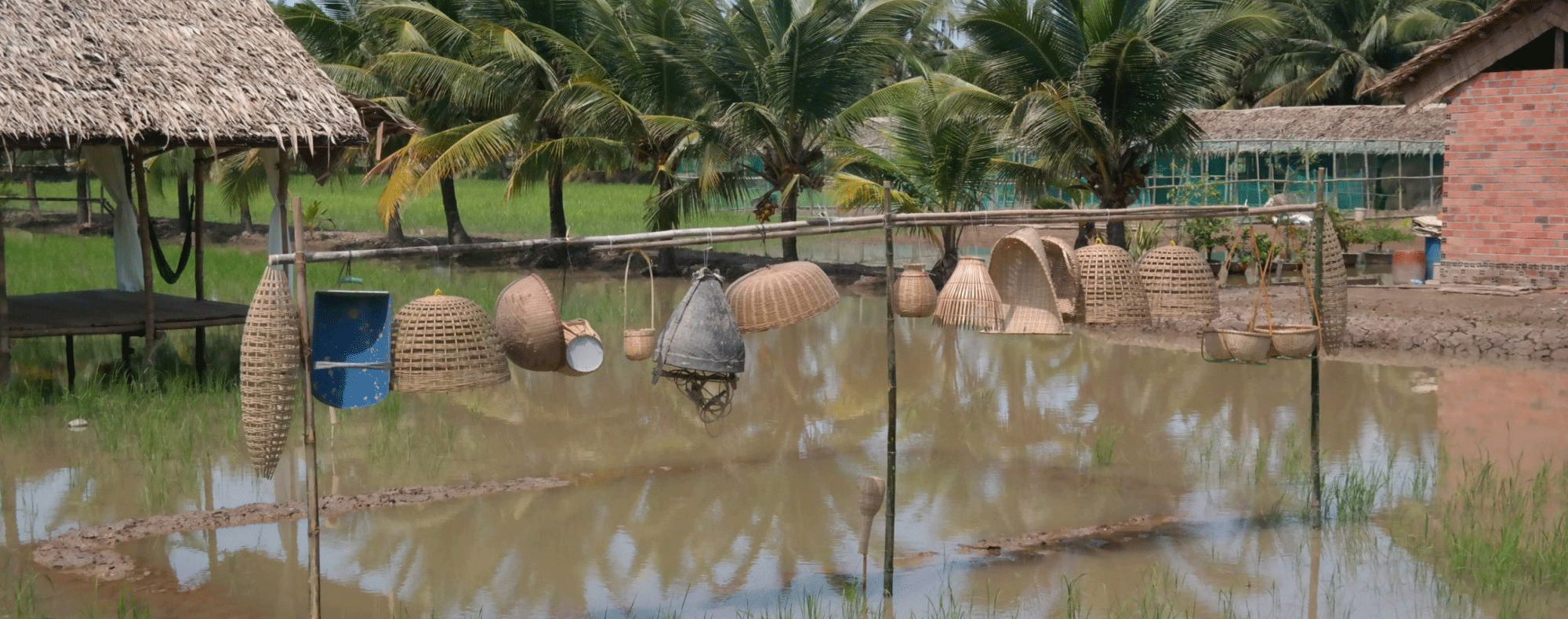 Du lịch Trà Vinh đến với nông trại Rithy, bạn sẽ được trải nghiệm mô hình canh tác nông nghiệp với không gian cực chill, thiết kế mộc mạc, giản dị, thân thương. Du khách sẽ có cái nhìn chân thực về cuộc sống sinh hoạt thường nhật của nông dân Trà Vinh. Các nông cụ, vật dụng gắn liền quy trình trồng lúa nước được bày trí vô cùng sinh động.