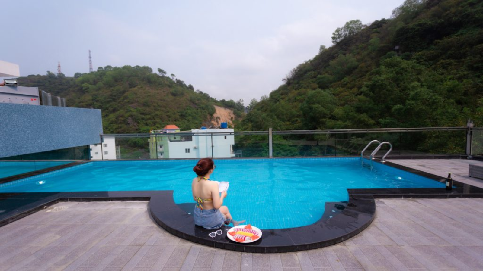 Bể bơi bốn mùa & Sky Bar trên tầng thượng, có hệ thống nước nóng, lọc nước tự động, thích hợp thư giãn ngắm cảnh.