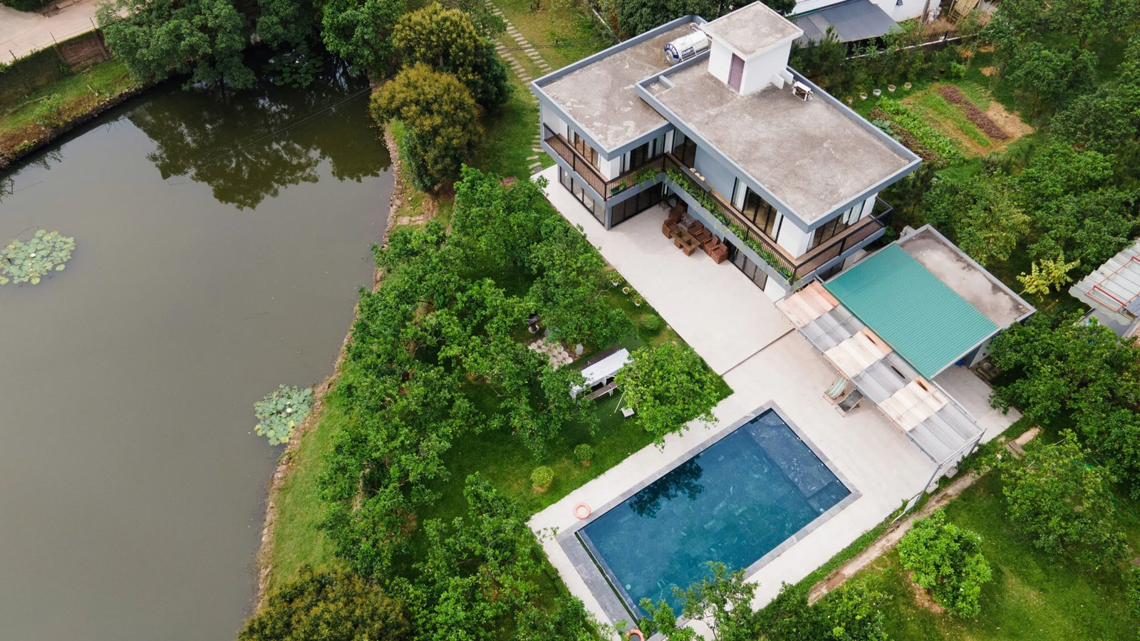 - Bể bơi giữa vườn (10mx5m, sâu 1.5m, có phần bể nông cho trẻ em 0.8m và có áo phao cho trẻ em), hệ thống lọc nước an toàn, đảm bảo sức khoẻ.