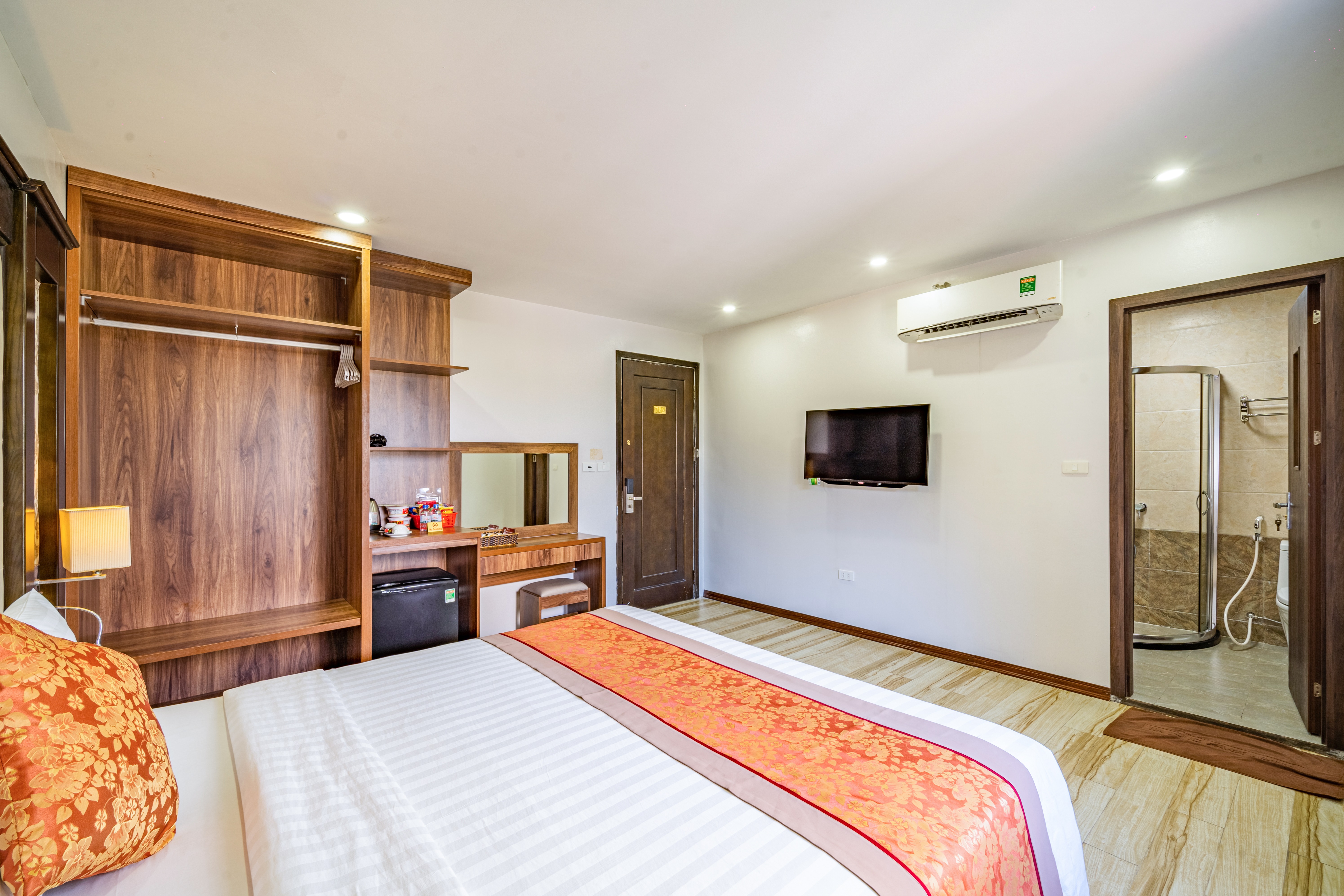 Điều hòa, TV màn hình phẳng, minibar, ấm đun nước, bàn làm việc.
