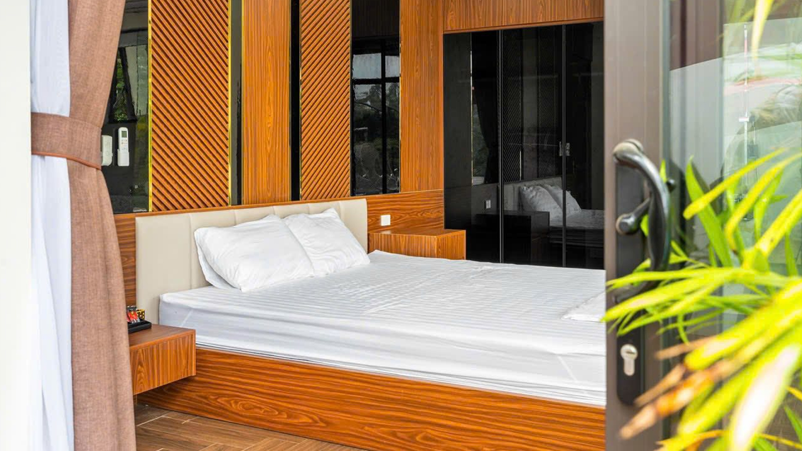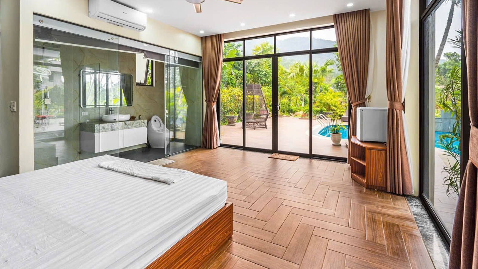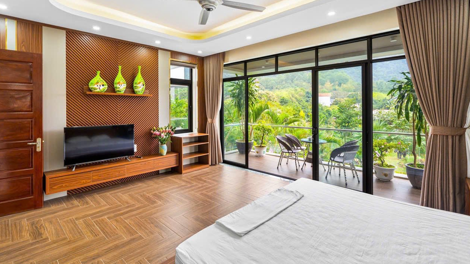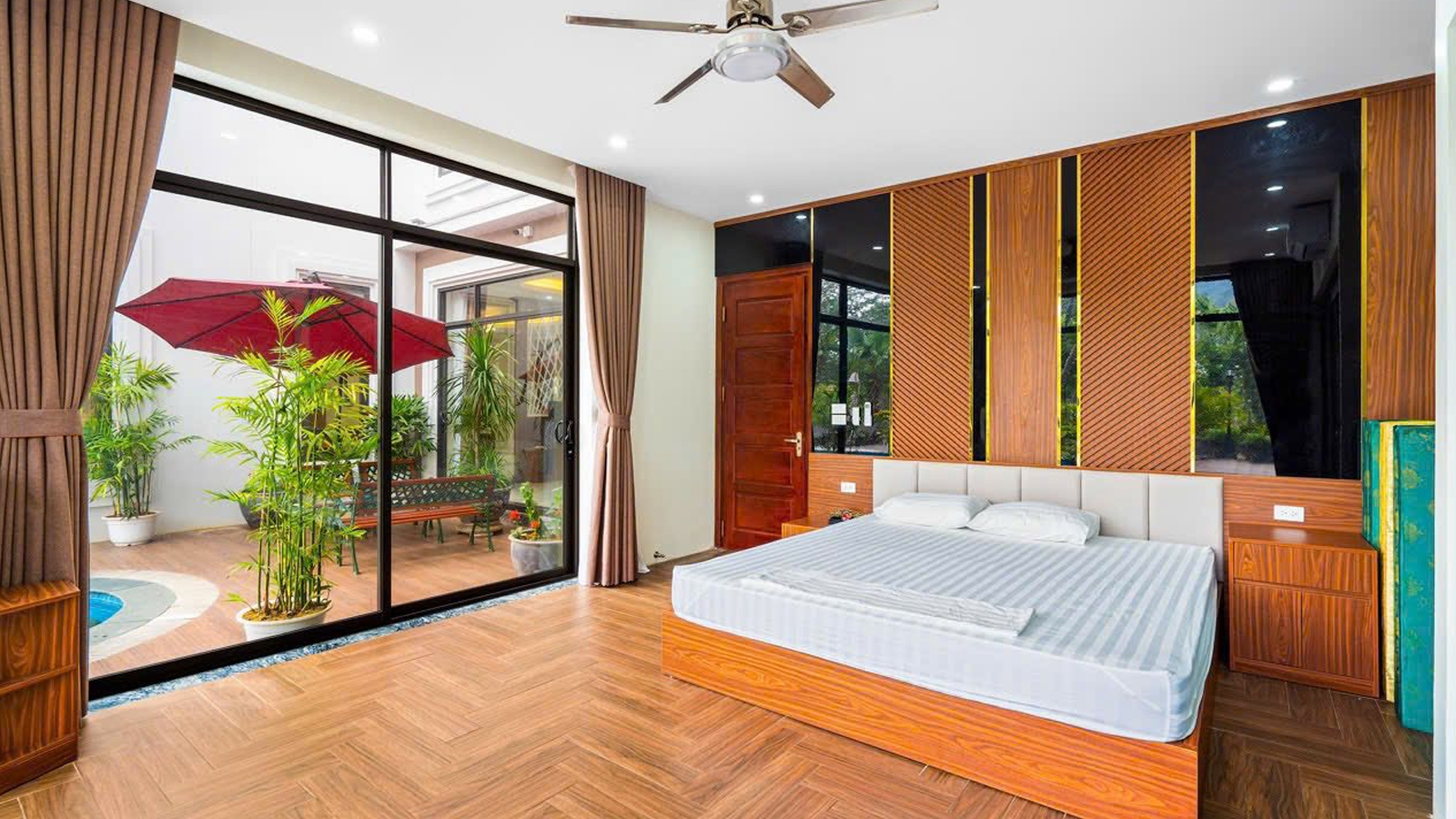 Trâm villa được thiết kế với 7 phòng ngủ riêng biệt khép kín với ban công rộng, thoáng đãng, mỗi giường ngủ của villa rộng từ 2mx2m2 đến 2m2x2m, và 10 đệm phụ đơn 1m2x2m, nên thích hợp cho các đoàn từ 30 khách trở xuống.