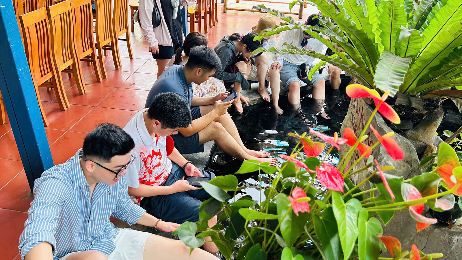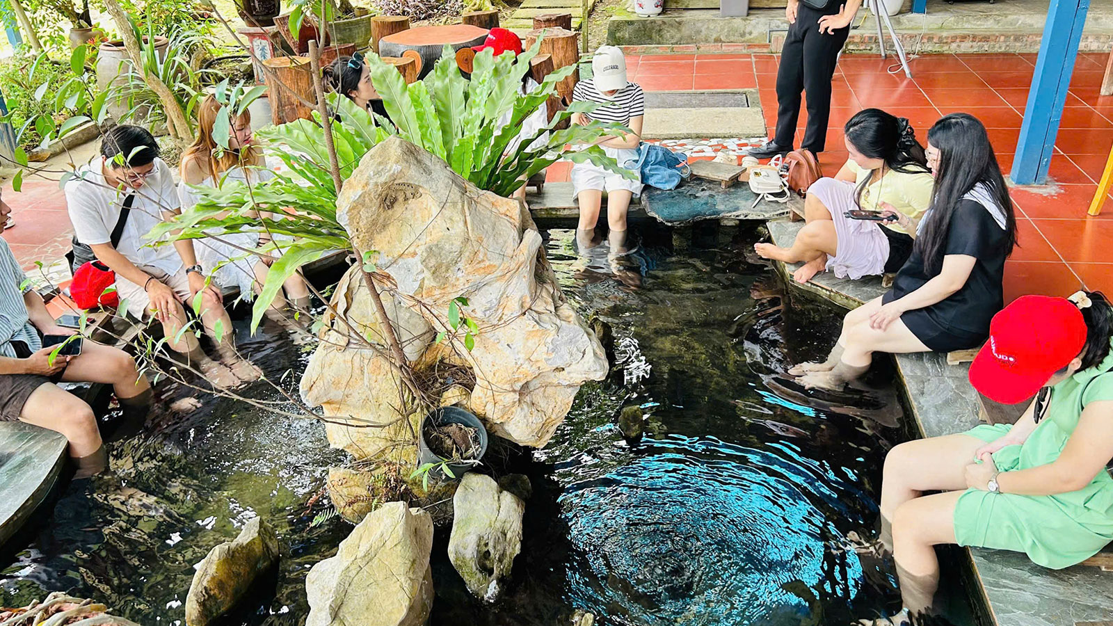 13h00 : Du Thuyền đưa quý khách đến bến Việt Hải, sau đó lên xe điện và di chuyển trên con đường thuộc Rừng Quốc Gia dưới Hang Voi và dưới những tán Cây Si lâu năm trải dài hai bên đường để đến với Làng Cổ Việt Hải. Dừng chân tại điểm tập kết và sử dụng xe đạp tự do khám phá quanh làng, sau đó vào khu vực trải nghiệm cảm giác “massage” chân bằng Cá ( Cá rỉa chân ).