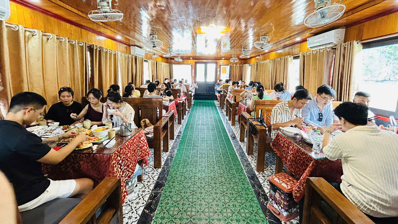 12h00: Sau khi tắm biển Quý khách dùng bữa trưa trên du thuyền sau đó nghỉ ngơi thư giãn trong khi tàu di chuyển chầm chậm vòng quanh vịnh Lan Hạ tới điểm kế tiếp để tiếp tục lịch trình tham quan điểm tiếp theo .