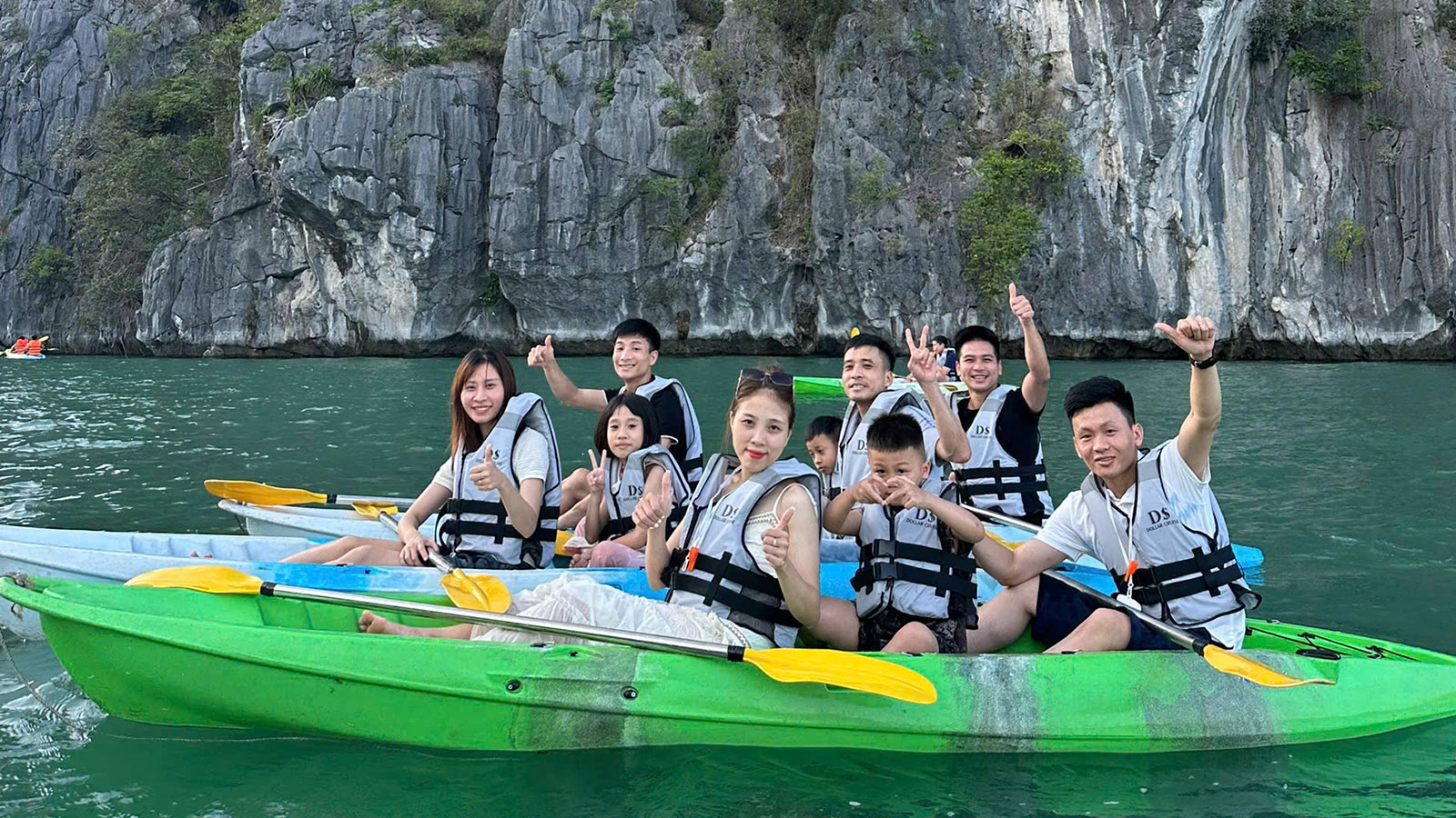 16h50 – 17h50: Tham quan 01 vòng Vịnh Lan Hạ. Quý khách lên bè ngắm cá, check in. Quý khách có thể tự do vui chơi chèo kayak, chụp ảnh. Sau đó du thuyền sẽ đưa Quý khách đến khu vực trung tâm Vịnh Lan Hạ, nơi có làn nước trong xanh nhất để tắm biển.