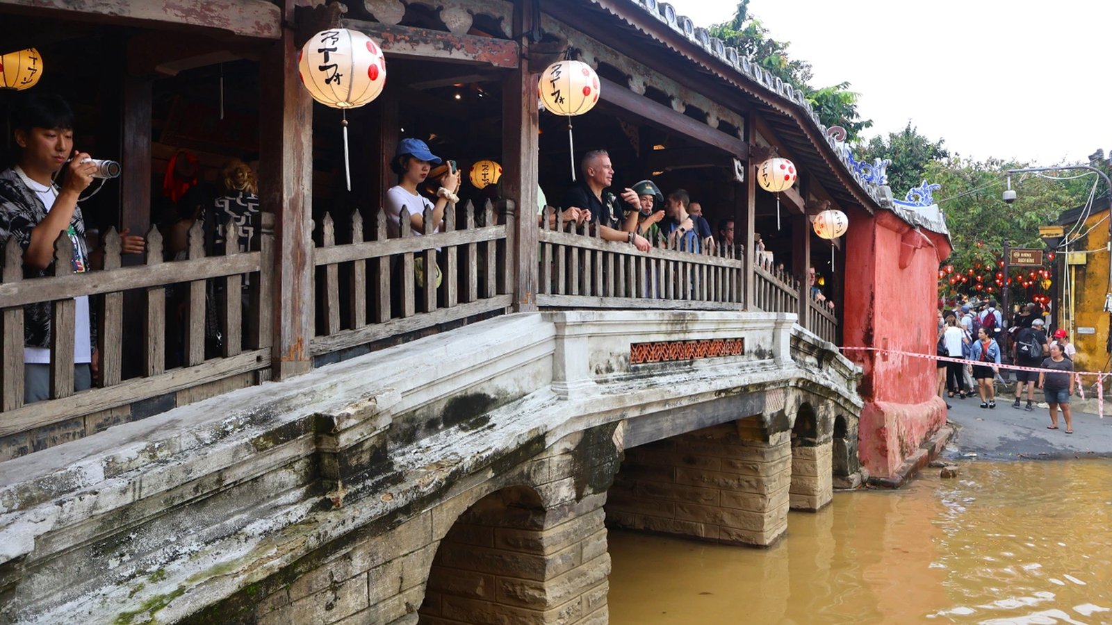 Dù nước lũ dâng cao, các tuyến phố cổ vẫn tấp nập du khách quốc tế. Bà Marine (42 tuổi, du khách Pháp) cho biết dù lịch trình tham quan bị thay đổi do lũ lụt, nhưng đây lại là một kỷ niệm đáng nhớ.