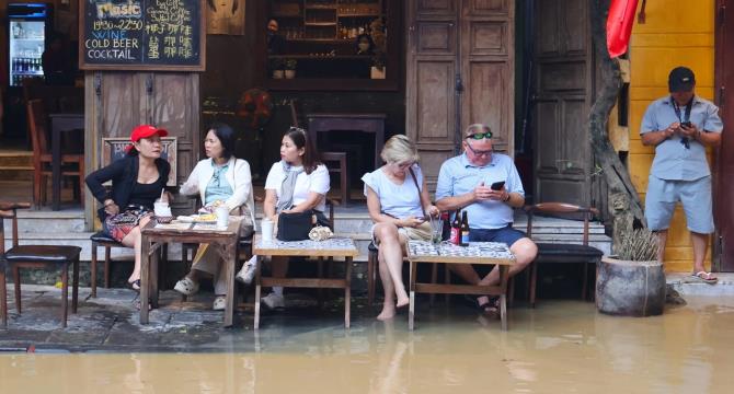 Tuy nhiên, thay vì lo lắng, người dân Hội An đã biến thách thức thành cơ hội, tạo ra những trải nghiệm độc đáo thu hút du khách. Các quán cà phê, nhà hàng nhanh chóng bày biện bàn ghế, tạo "view" ngắm lũ lụt mới lạ, độc đáo.