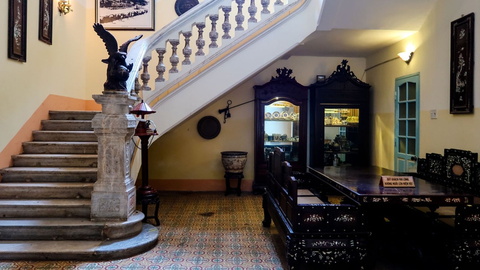 Nội thất tinh xảo: Sàn lát gạch bông Pháp, đèn chùm nhập khẩu, bàn ghế gỗ quý chạm khắc tinh vi.