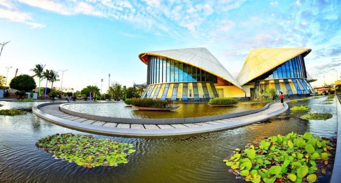 Điểm nhấn: Không gian rộng lớn, hiện đại với tượng đài "cây đàn kìm" khổng lồ, biểu tượng của nghệ thuật đờn ca tài tử Nam Bộ.