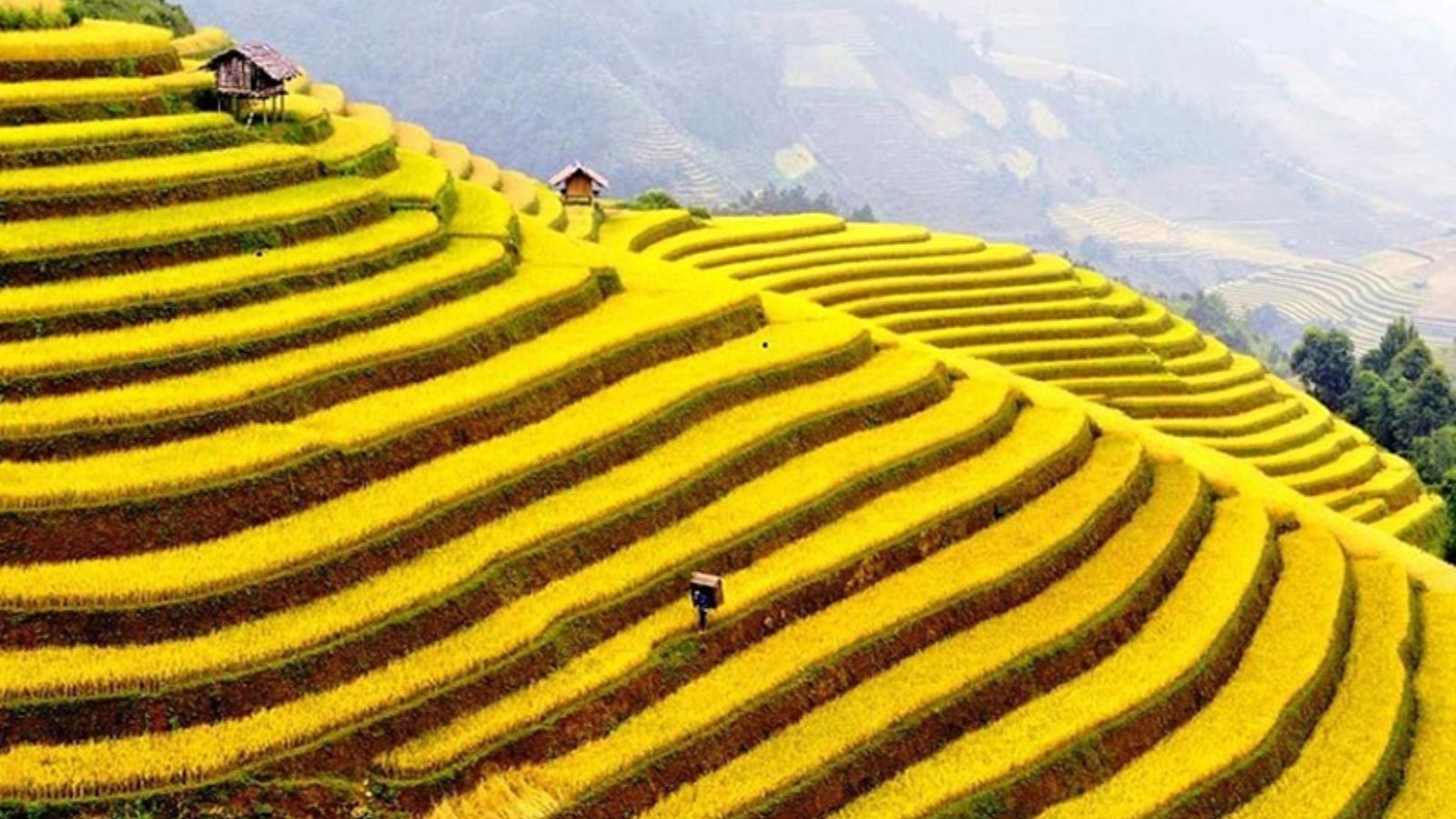 Tháng 10 là mùa vàng đẹp nhất trong năm. Những thửa ruộng bậc thang chín vàng óng ả, nối tiếp nhau trên sườn núi tạo nên khung cảnh ngoạn mục, được National Geographic xếp vào top ruộng bậc thang đẹp nhất thế giới.