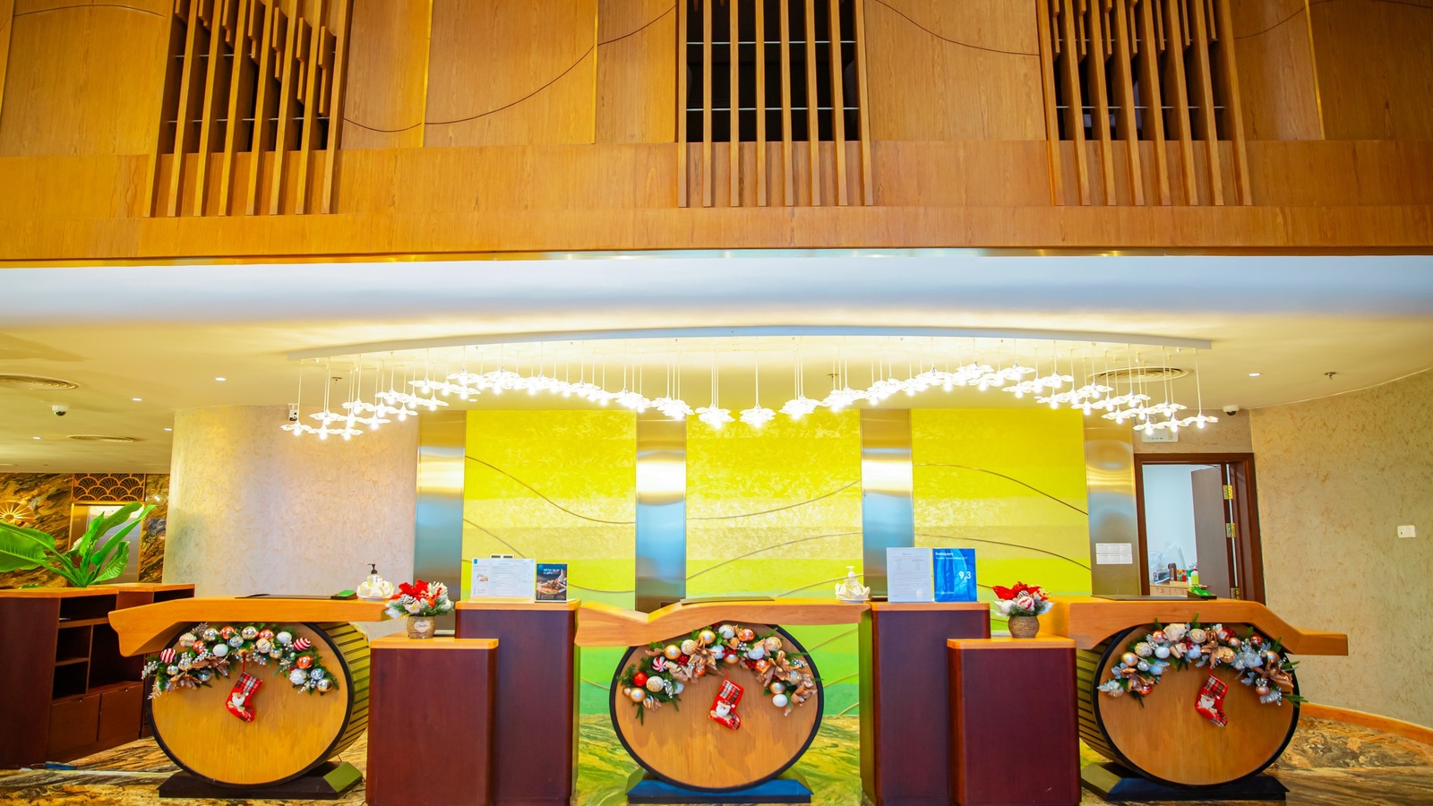 Không gian KK Sapa Hotel chủ yếu sử dụng gỗ hoặc sơn màu gỗ, điểm nhấn là những cột tròn to sơn vàng đồng tại khách sạn được lấy ý tưởng từ những cột nhà của người dân tộc.Phía trên trần nhà được trang trí đèn cách điệu nhìn như những ngọn sóng nhẹ lấp lánh.