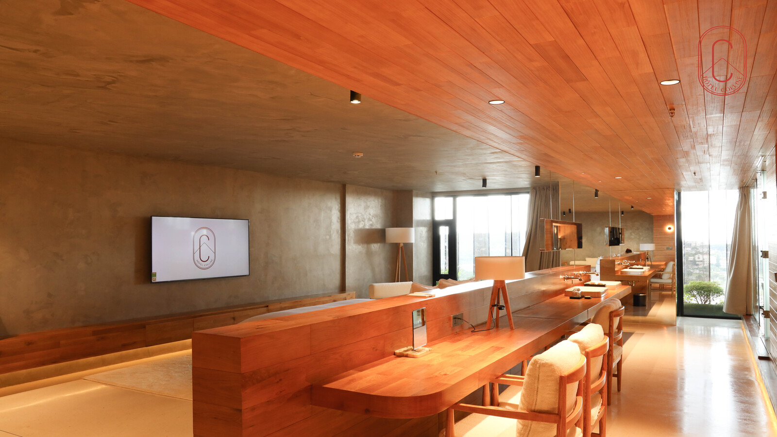 Việc sử dụng tối đa vật liệu gỗ mang lại cảm giác sang trọng cho khu nghỉ dưỡng đồng thời thân thiện với môi trường và không gian xung quanh.