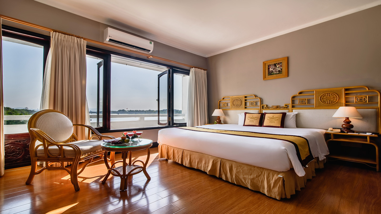 Được thiết kế với diện tích 32m², trang bị 1 giường đôi lớn hoặc 2 giường đơn, view phòng hướng ra dòng sông Hương êm đềm, thơ mộng. Nội thất phòng được trang trí với tone màu vàng sang trọng. Căn phòng này là lựa chọn rất thích hợp cho những đôi bạn thân hoặc nhóm bạn ít người có thể lựa chọn làm nơi lưu trú lý tưởng cho kỳ nghỉ của mình.