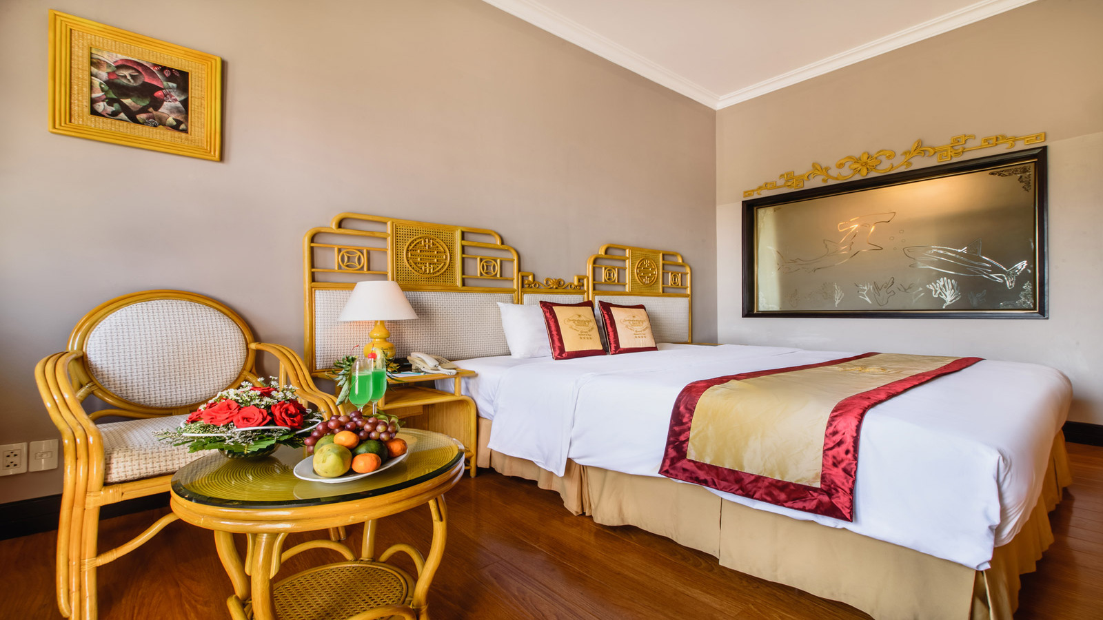Diện tích phòng khoảng 60m², được thiết kế với 2 phòng thông nhau, sức chứa phòng dành cho 4 người lớn và 1 trẻ em. Trong phòng trang bị 1 giường đôi cỡ lớn và 2 giường đơn, trang bị đầy đủ các tiện ích cơ bản phục vụ quá trình lưu trú. Loại phòng này là sự lựa chọn tuyệt vời cho các gia đình khi nghỉ dưỡng tại Huế.