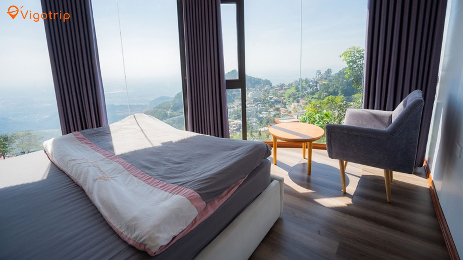 Mộng Mơ Infinity mang đến trải nghiệm view đẹp cực "hot" với hệ thống cửa kính chạm trần 4 phía, villa này bắt trọn vẻ đẹp của Tam Đảo từ trên cao. Căn villa này có thiết kế hiện đại, sang trọng, gồm 2 phòng ngủ, nhà vệ sinh riêng, điều hòa và nước nóng lạnh 24/7.