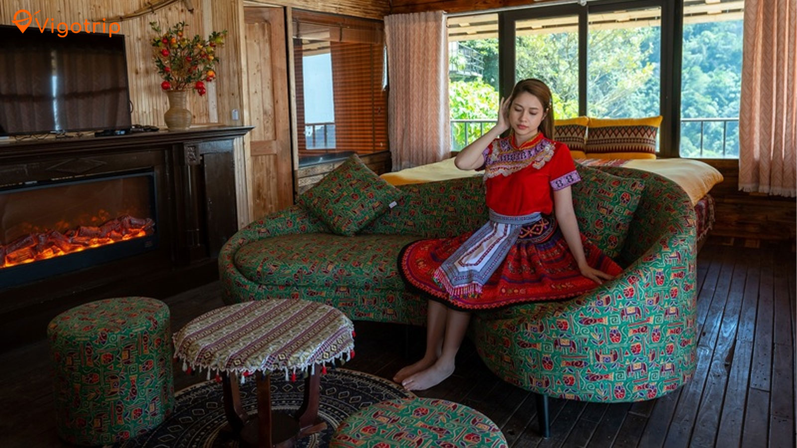 Nhà Vua Mèo được thiết kế dạng villa, căn hộ này được xây dựng hoàn toàn bằng gỗ thông chắc chắn, bao gồm một phòng ngủ, nhà vệ sinh riêng và một phòng tắm với bồn tắm thông minh. Phòng ngủ phù hợp cho 6 người với 2 giường kích thước 1m8x2m. Phòng có thiết kế mang đậm bản sắc dân tộc độc đáo với ghế sofa là điểm check-in được yêu thích nhất. Ngoài ra, căn phòng còn có chiếc giường King màu vàng với view đẹp cho những ai yêu thích "săn mây".