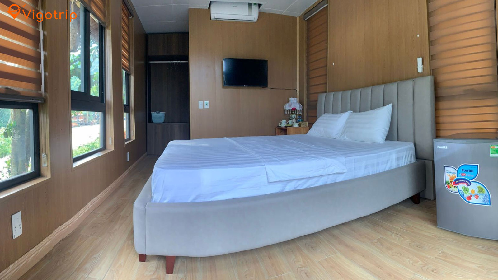 - Tiện nghi: Giường đôi lớn, phòng tắm riêng, điều hòa, tủ lạnh.