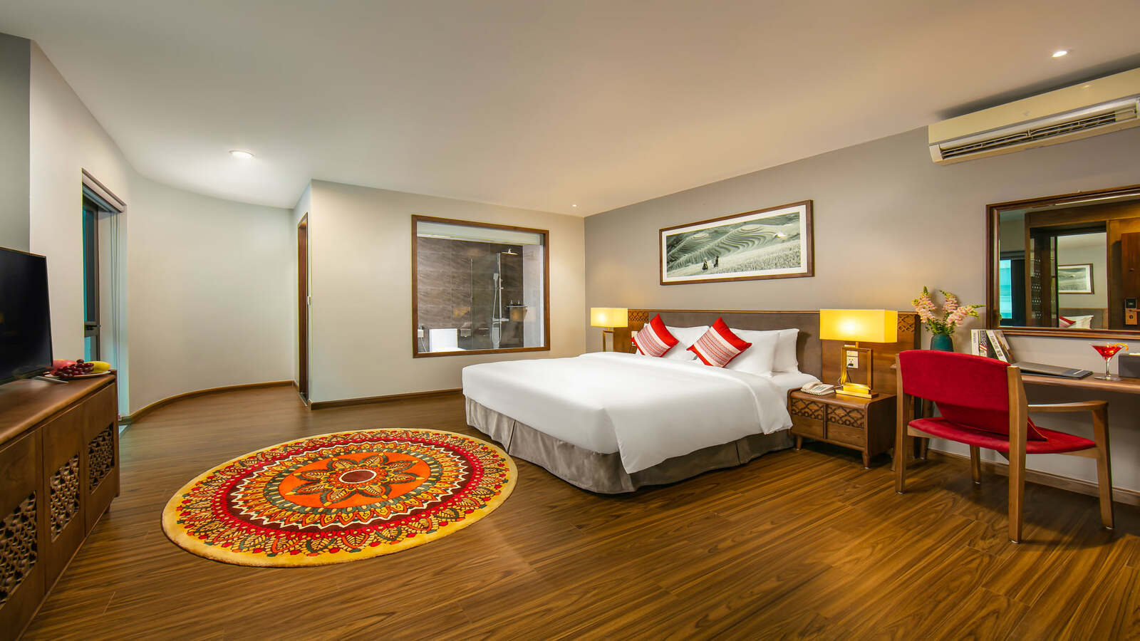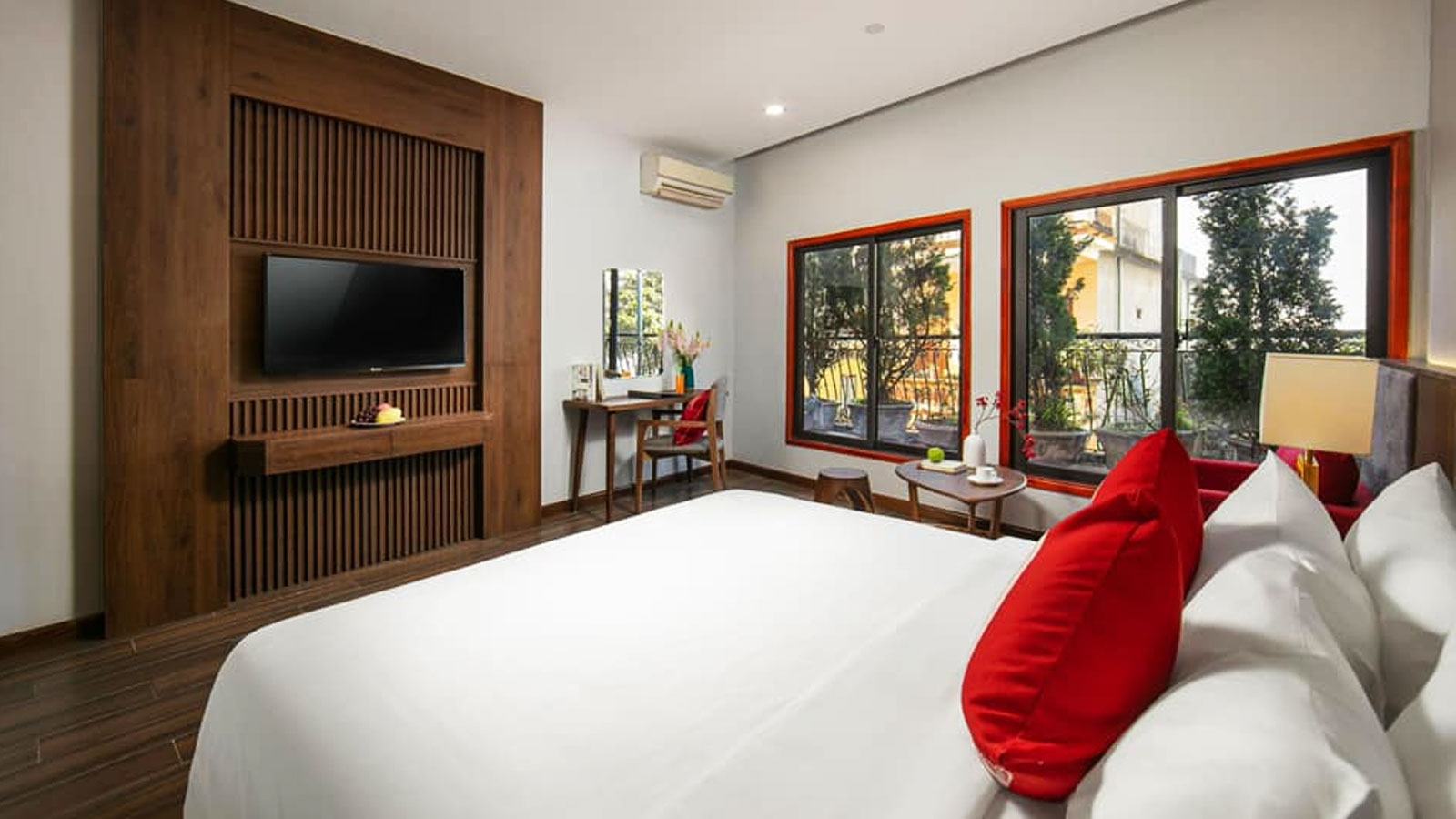 Thiết kế tương tự phòng Standard nhưng Superior có diện tích rộng hơn và màu sắc nổi bật hơn. Điểm nhấn trong không gian là bộ sofa màu đỏ và các họa tiết hoa văn thổ cẩm độc đáo.