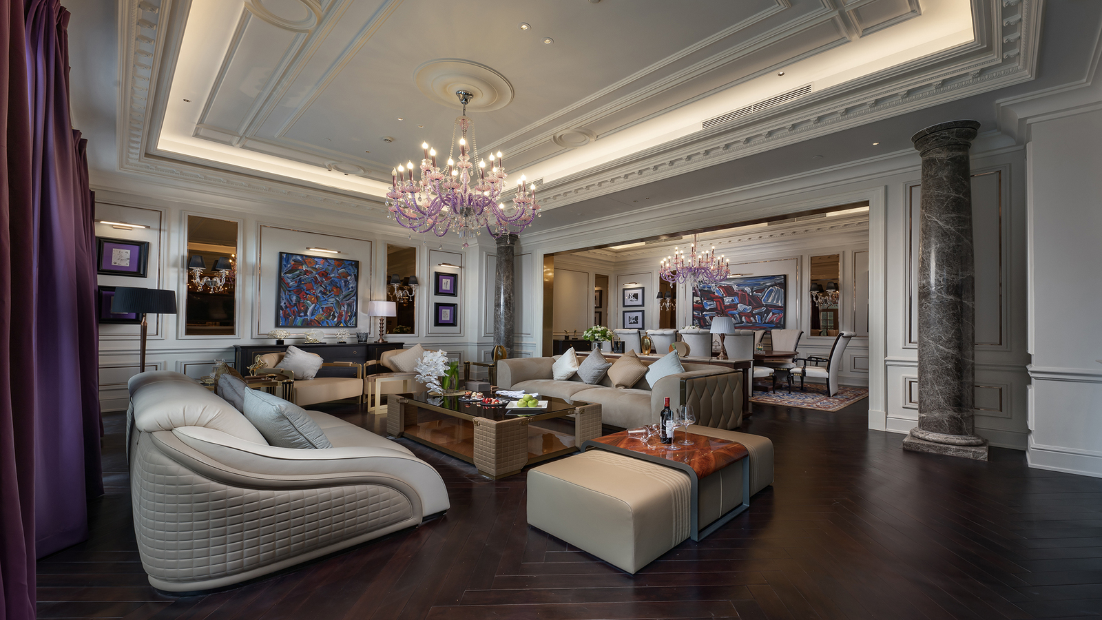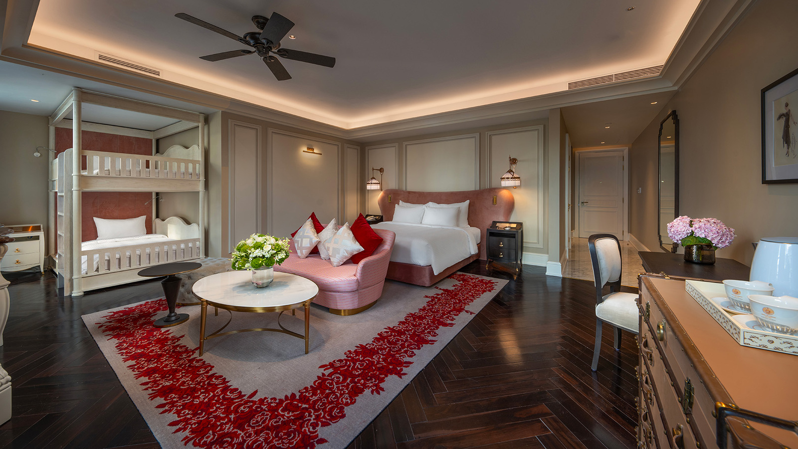 Presidential Suite sở hữu phòng khách siêu lớn, không gian phòng tiệc nhỏ sang trọng, một phòng ngủ hoàng gia với giường siêu lớn và phòng ngủ thứ hai với hai giường đơn thoải mái, đảm bảo không gian thư giãn lý tưởng và riêng tư cho kỳ nghỉ độc bản dành riêng cho những vị khách thượng lưu.
