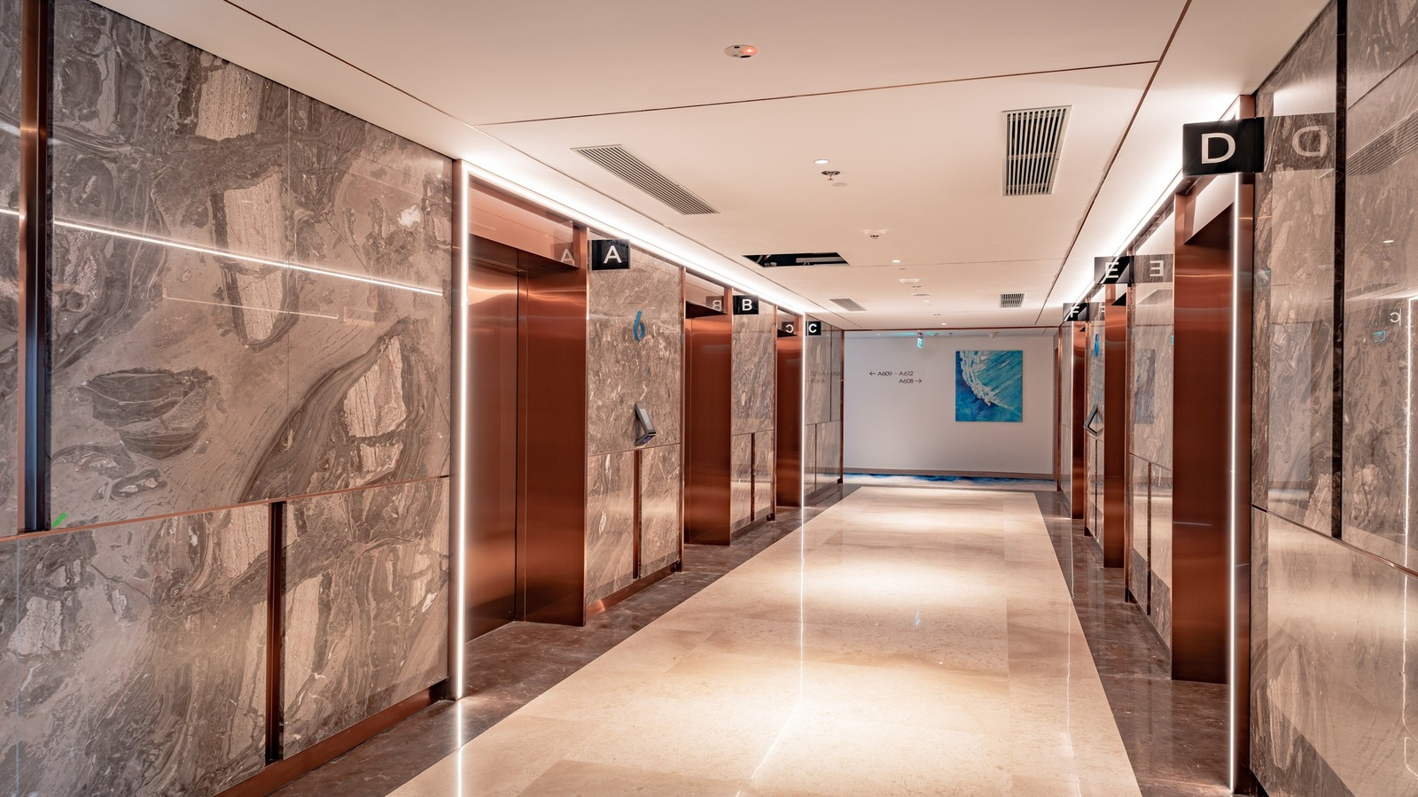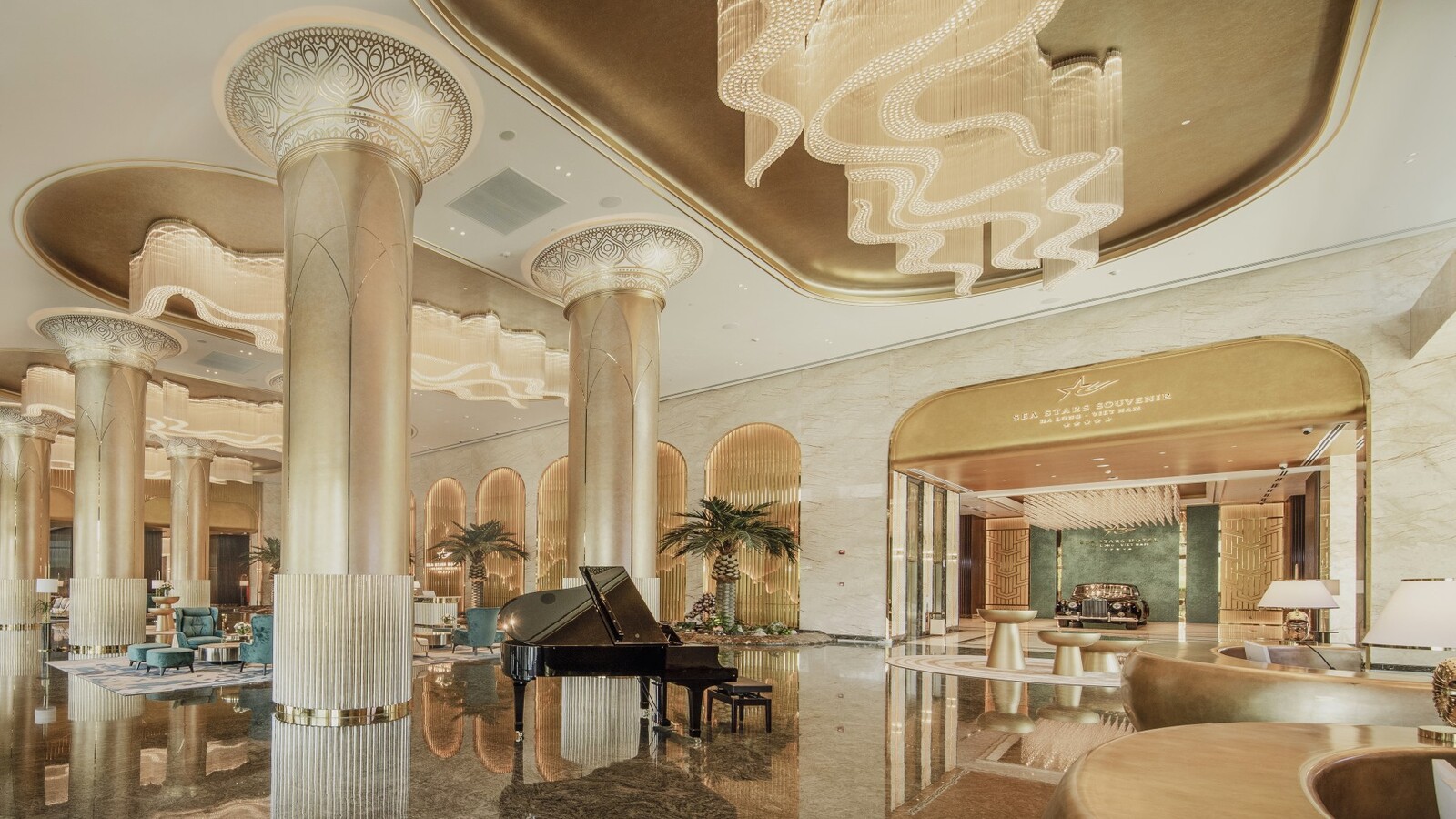 Lối thiết kế ấn tượng bao quanh là những bức tường bằng kính mang hiệu ứng 3D với tông màu chủ đạo là màu be nâu xen kẽ xanh dương - mang đặc trưng “hơi thở” của đại dương. Nội thất trong toàn bộ khách sạn đều là những chiếc ghế sofa, cửa kính và bàn đá, gỗ cao cấp, được lựa chọn một cách kỹ lưỡng để vừa phù hợp với concept thiết kế lại đảm bảo được sự thoải mái, tiện nghi cho khách lưu trú.