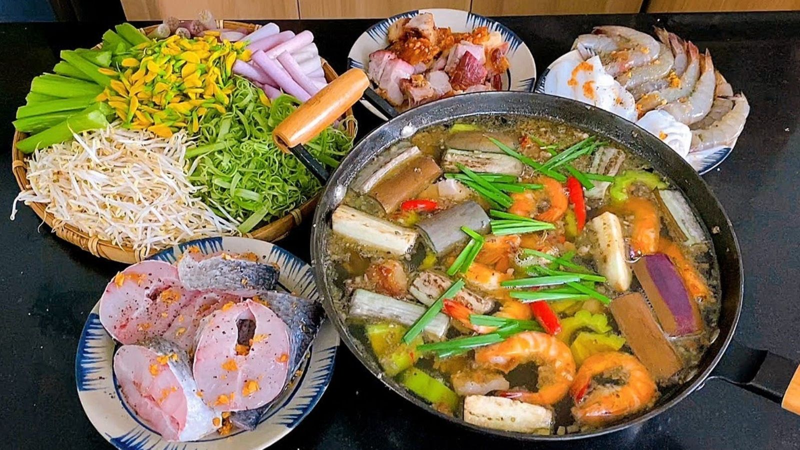 Nguyên liệu kèm: Cá tươi (cá basa, cá kèo), thịt ba rọi, tôm, mực cùng hơn 10 loại rau đồng như bông súng, rau nhút, rau đắng…