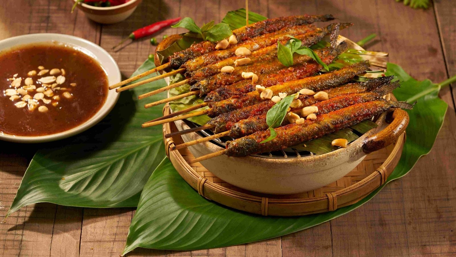 Đặc trưng: Cá kèo tươi xiên que, tẩm muối ớt rồi nướng trực tiếp trên than hồng.