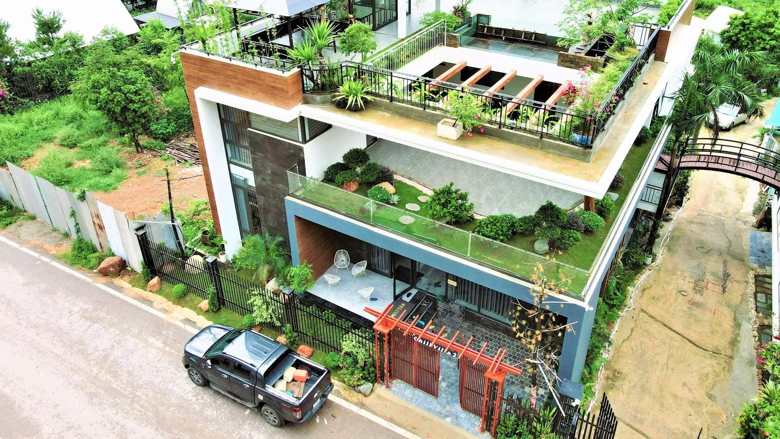 🌳 Sân vườn tầng 3 rộng, có bể cá Koi & Lầu vọng nguyệt view toàn hồ