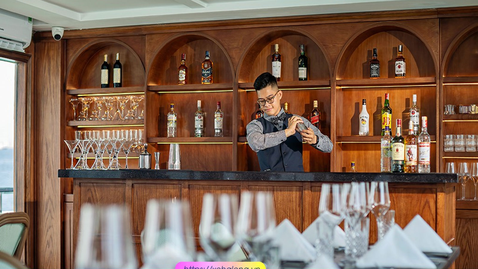 Quầy bar sang trọng, không gian lounge đọc sách yên tĩnh.