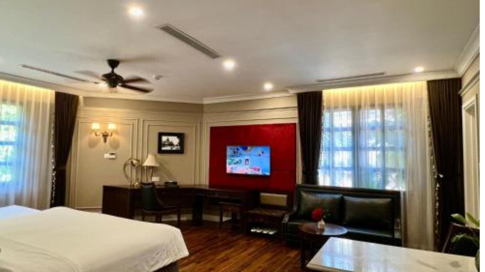 Khách sạn còn có nhà hàng phục vụ thực đơn phong phú, kết hợp giữa ẩm thực truyền thống Việt Nam và món Âu tinh tế, cùng quầy bar sang trọng – nơi bạn có thể thư giãn với những ly cocktail đặc biệt sau một ngày dài.