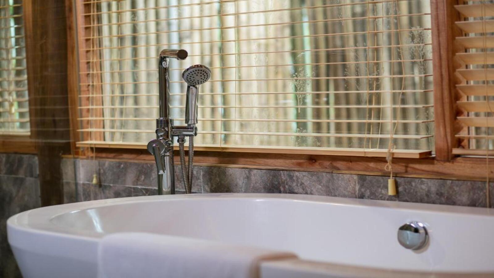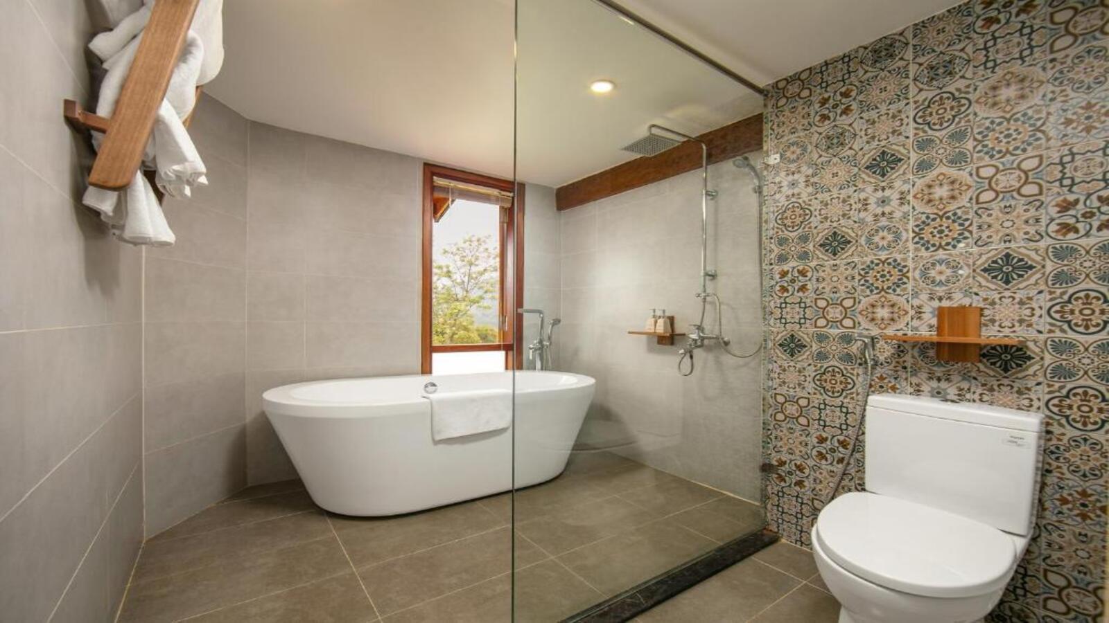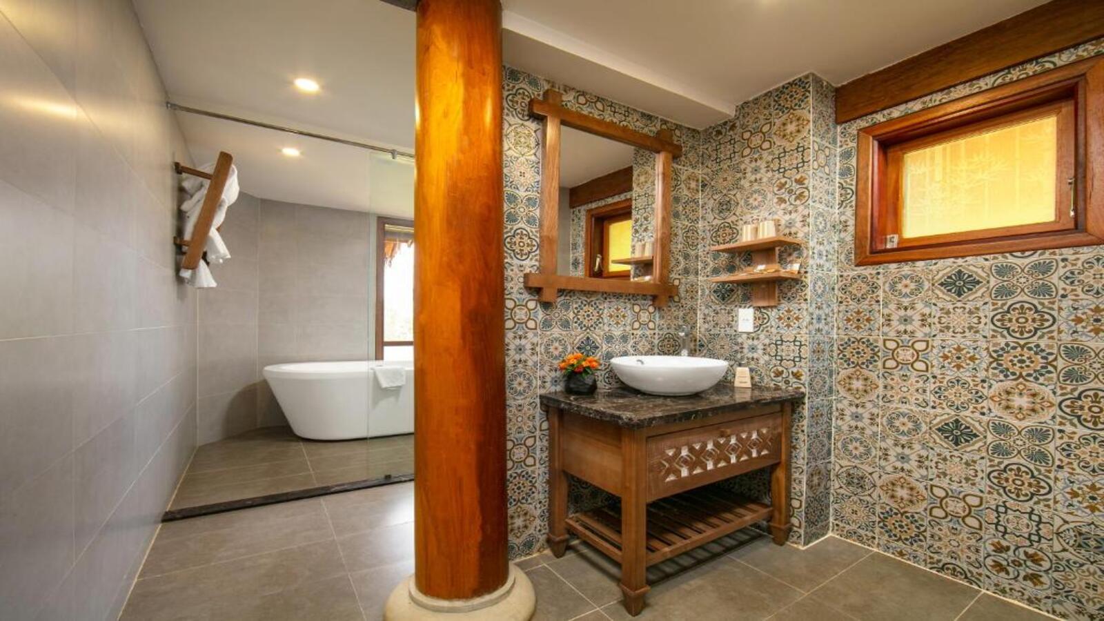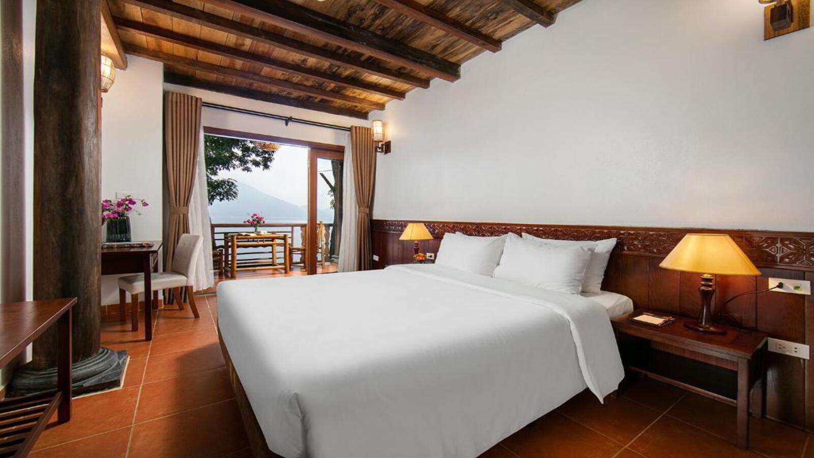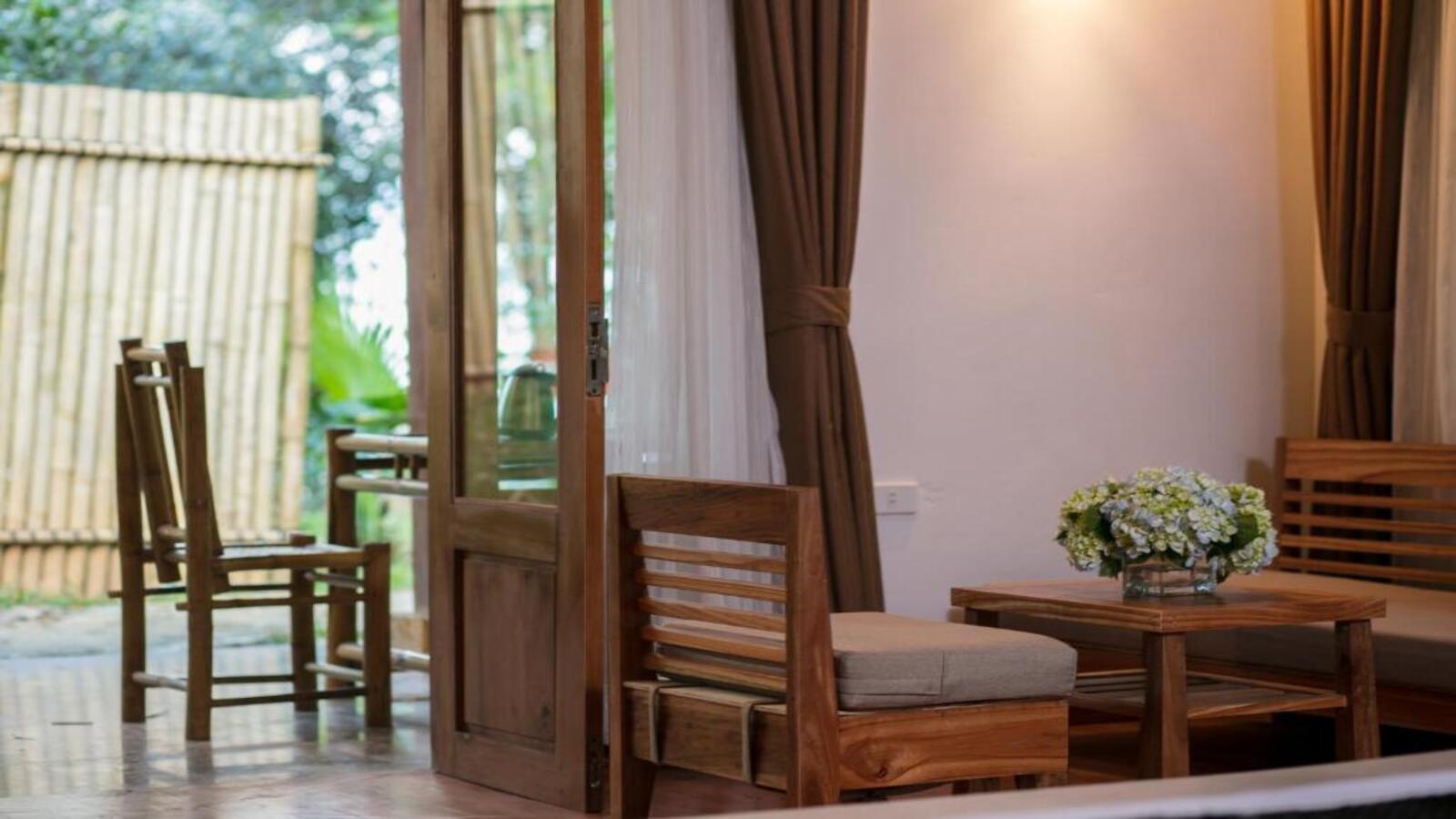 Các phòng đều có mái tranh và nội thất gỗ, mang lại cảm giác mộc mạc cho phòng nghỉ. Tất cả các phòng đều có máy điều hòa, sân hiên và ban công riêng. Tủ lạnh mini và ấm đun nước cũng được bố trí trong phòng. Phòng tắm riêng được trang bị bồn tắm và vòi sen.