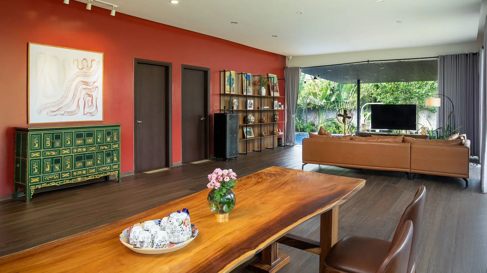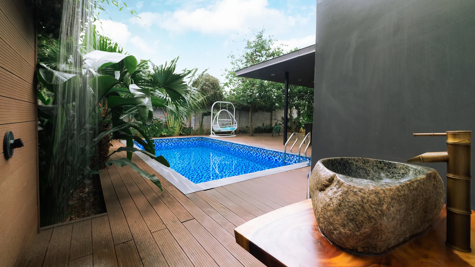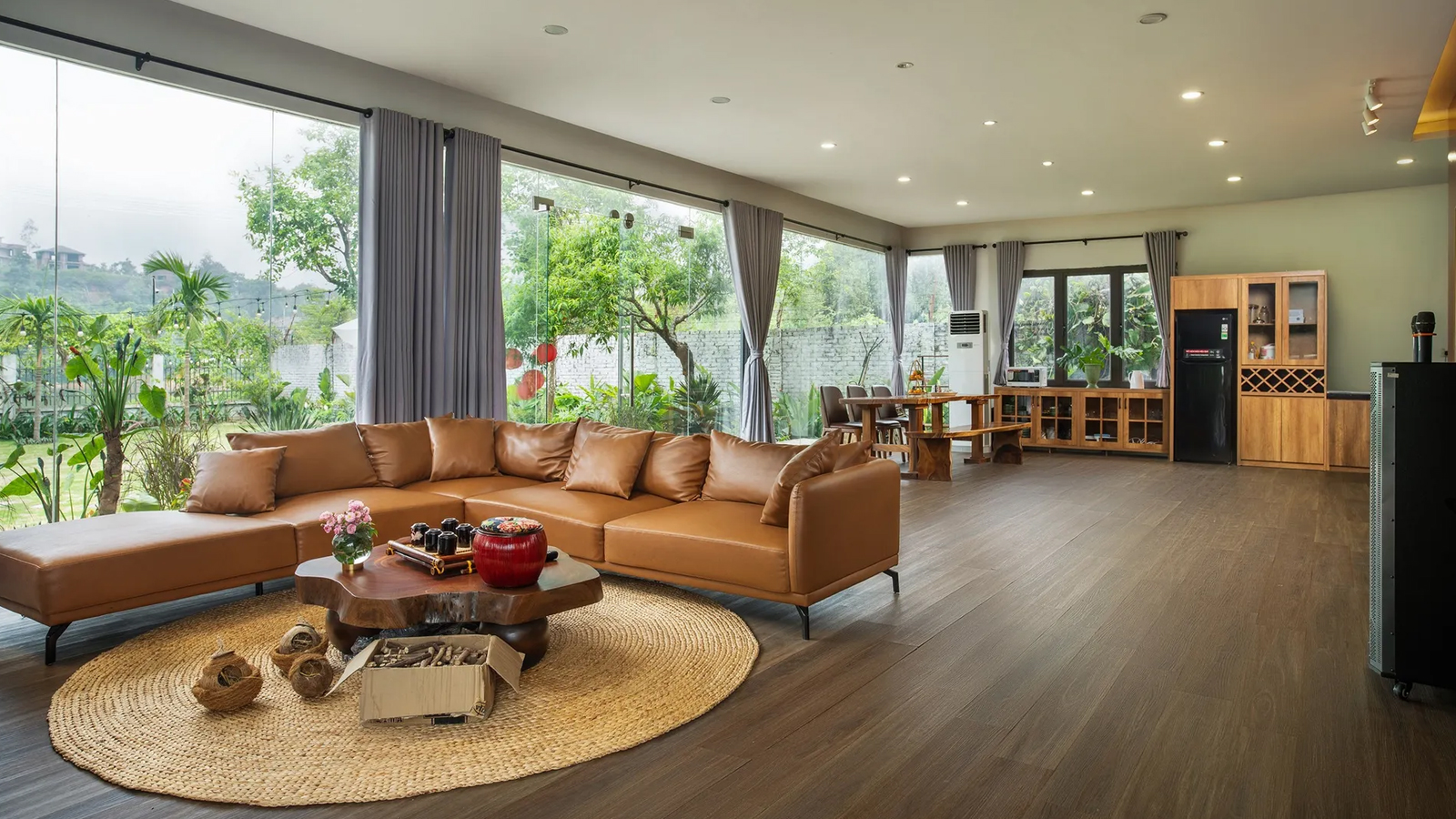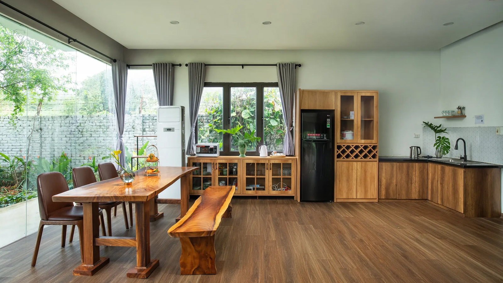 Phòng bếp: bếp nướng, 2 bếp lẩu, tủ lạnh, ấm siêu tốc, bát đũa, gia vị cơ bản (mắm, muối, dầu ăn) (khách tự chuẩn bị nước lọc)