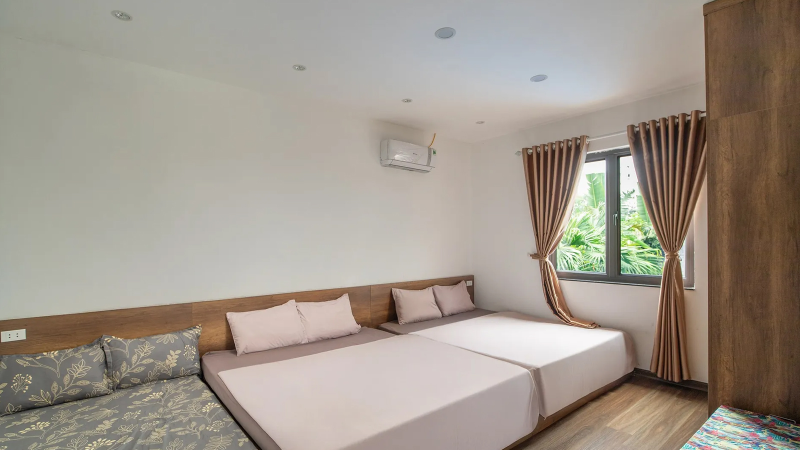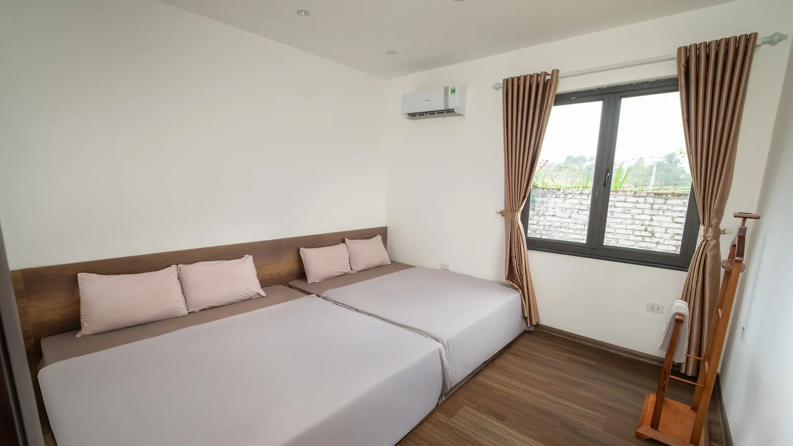 2 phòng ngủ, 4 giường 1m8, 1 đệm phụ, điều hoà 2 chiều riêng mỗi phòng, 1 phòng vệ sinh trong nhà + 1 phòng vệ sinh sau nhà cạnh vòi tắm ngoài trời đầy đủ đồ vệ sinh cá nhân (quý khách vui lòng tự chuẩn bị bàn chải đánh răng)