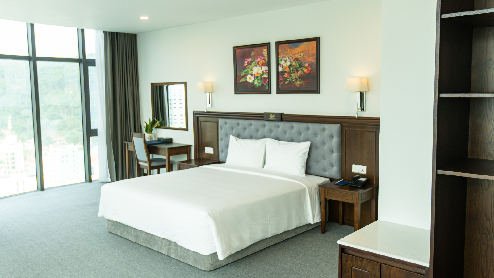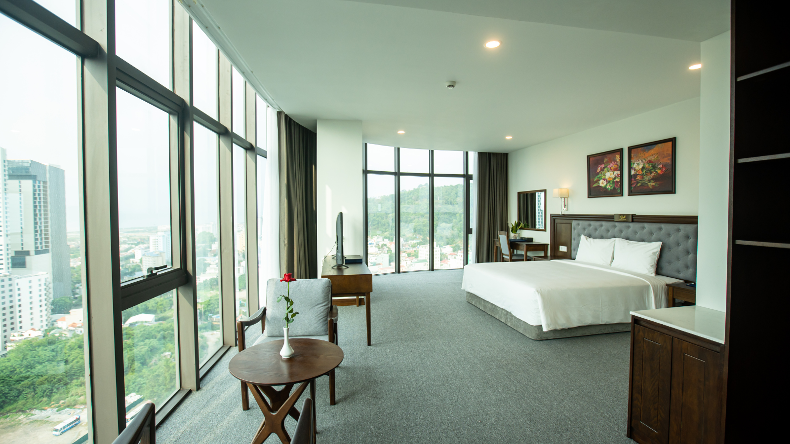 - Nhiều phòng có cửa kính lớn hoặc ban công, nhìn ra thành phố hoặc vịnh.